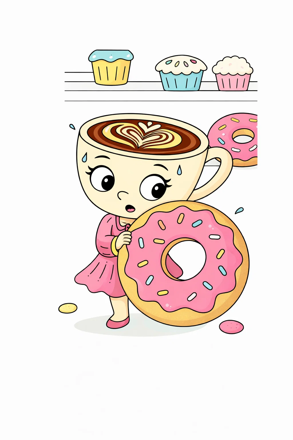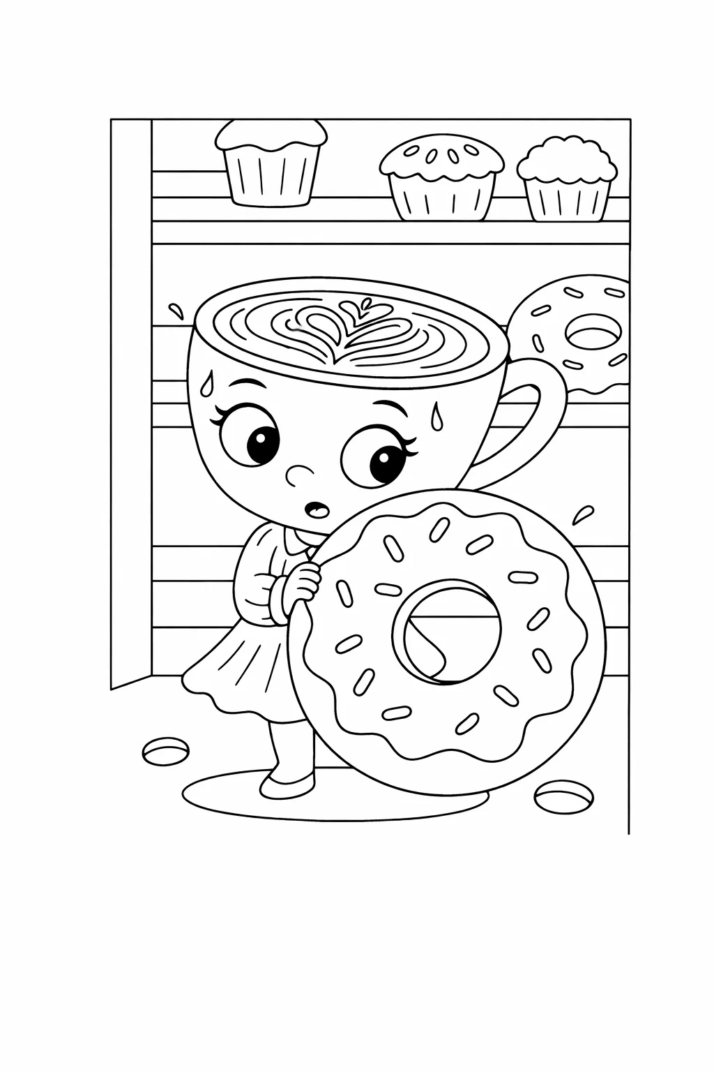 Весела та креативна розфарбовка із зображенням милої балерини-капучино, яка тримає великий пончик у кондитерській, стане чудовим варіантом для дитячої творчості. Цей малюнок розмальовка поєднує фантазійного персонажа та смачні солодощі, що робить процес розфарбовування ще цікавішим. Розфарбовка допомагає розвивати уяву, уважність і дрібну моторику рук. Малюнок розмальовка ідеально підходить для занять вдома, у школі чи дитячому садку. Ви можете легко скачати та роздрукувати розфарбовку у форматі А4 для захопливого дозвілля дітей.