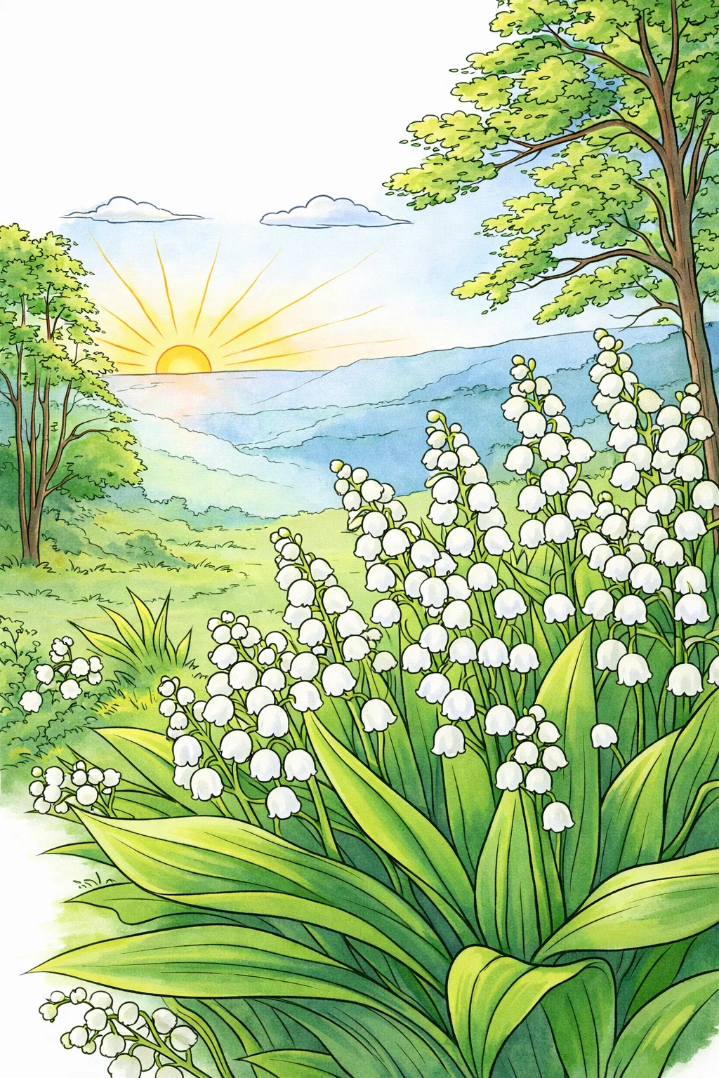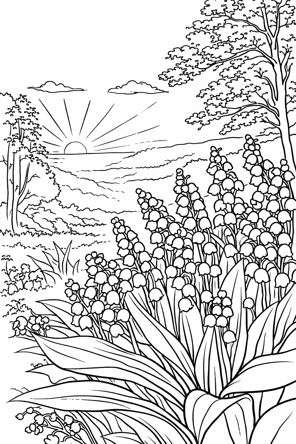 Ця весняна розмальовка з серії «Пори року» зображає ніжні конвалії на тлі пробудженої природи та ранкового сонця. Детальний малюнок розмальовка передає красу весняного пейзажу, допомагає дітям і дорослим розслабитися, розвинути уважність, уяву та дрібну моторику. Розфарбовка ідеально підходить для творчих занять удома, у школі чи дитячому садку. Малюнок розмальовка зручний для розфарбовування олівцями, фломастерами або фарбами, його легко скачати та роздрукувати у форматі А4 для приємного дозвілля.