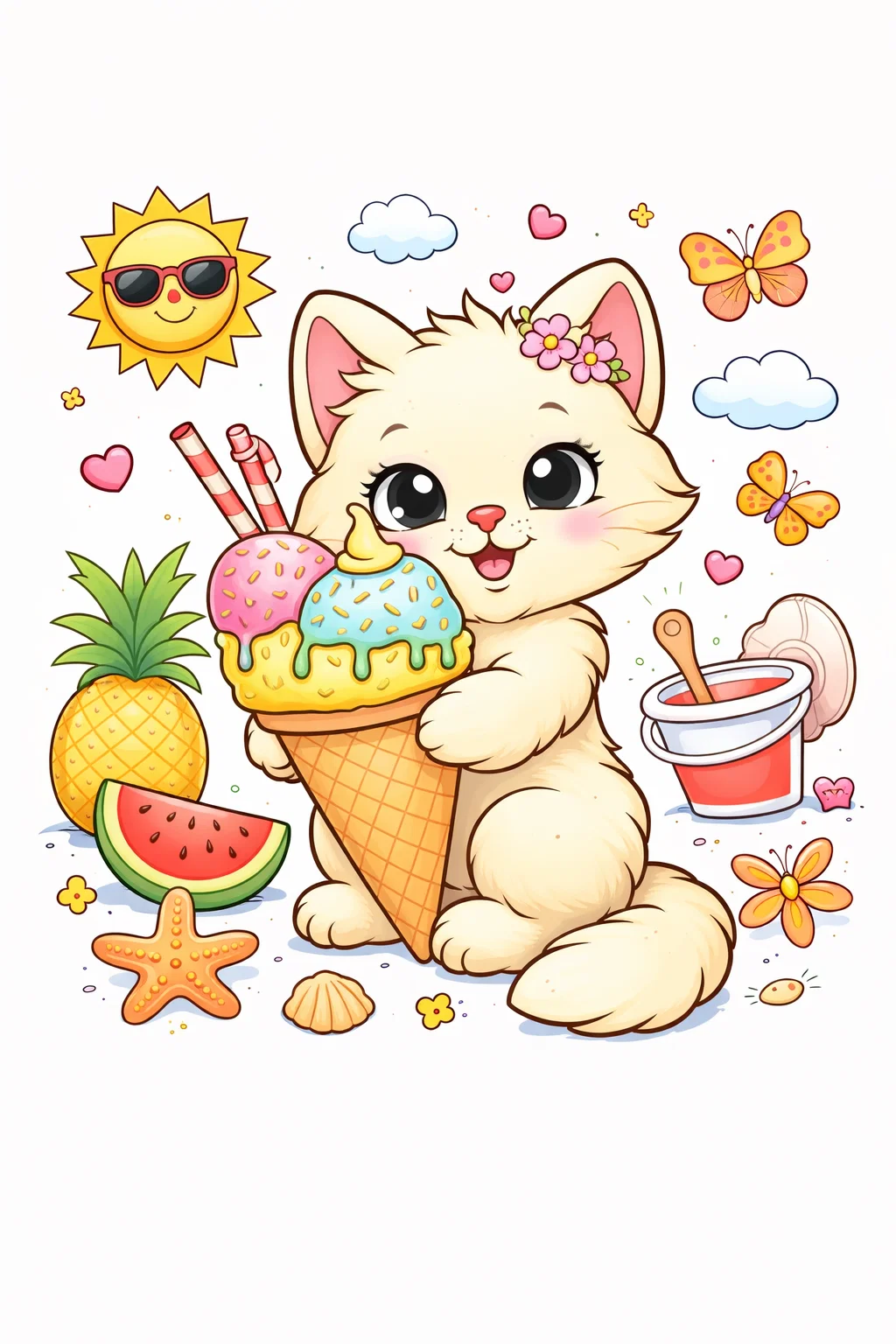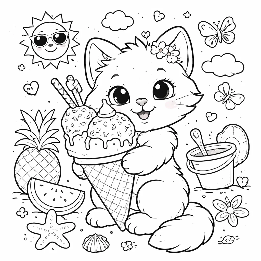 Чудова розмальовка для дівчат та хлопчиків яка зображає миле кошеня з великим морозивом на фоні літнього пляжу, сонця, фруктів і метеликів. Цей малюнок розмальовка наповнений позитивом і яскравим настроєм. Така розфарбовка розвиває дрібну моторику, фантазію та художнє мислення, а також дарує гарний настрій. Ідеально підійде для малюків і школярів. Ви можете скачати та роздрукувати в форматі А4 безкоштовно й одразу почати творити!