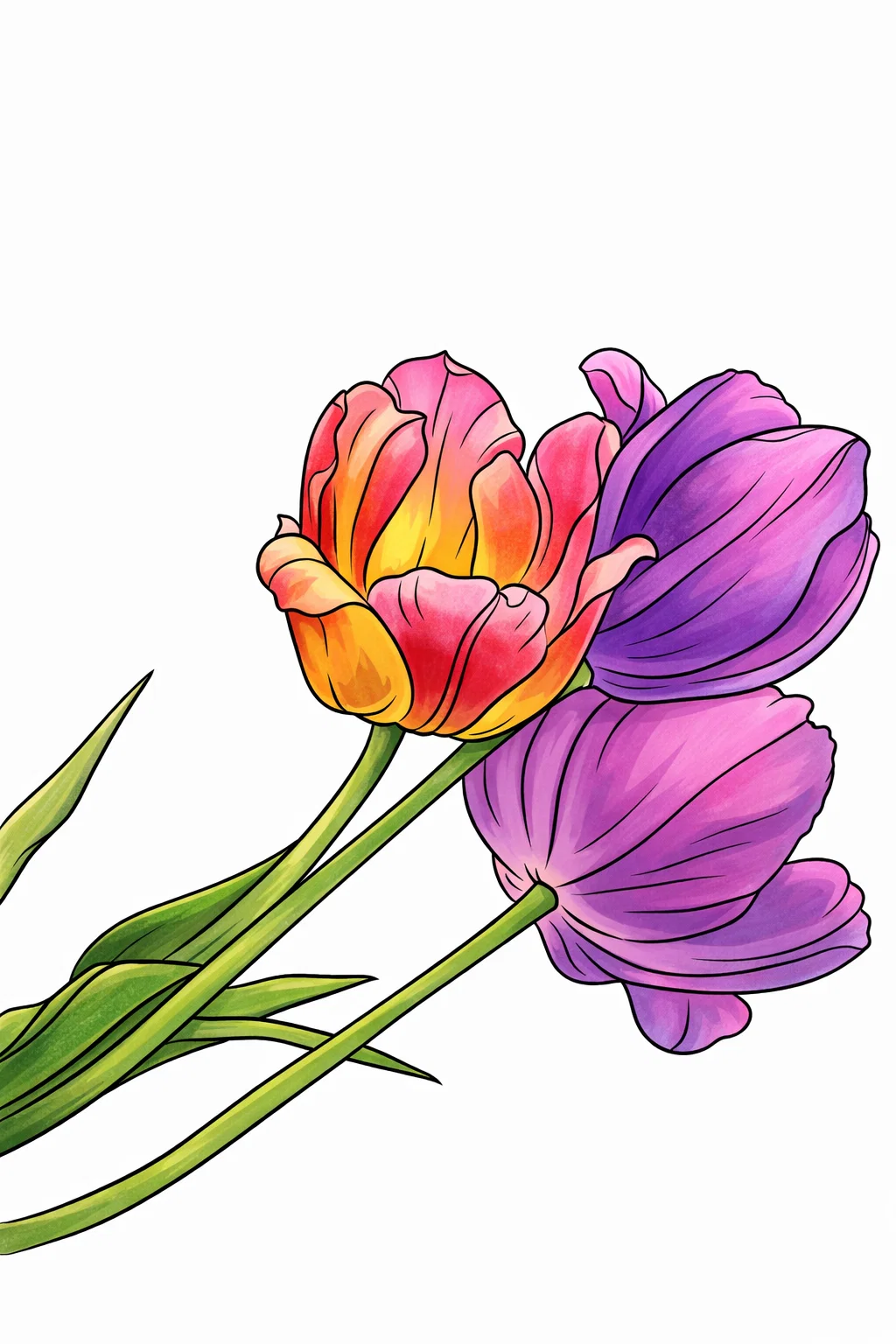 Красива квіткова розфарбовка з ніжними тюльпанами створює справжній весняний настрій і чудово підходить для святкової творчості. Детальний малюнок розмальовка із витонченими пелюстками та стеблами дозволяє створювати яскраві або пастельні кольорові композиції. Така розфарбовка стане гарною ідеєю для занять із дітьми, творчого відпочинку або підготовки святкових листівок. Малюнок розмальовка легко скачати та роздрукувати в форматі А4, щоб використовувати вдома, у школі або дитячому садку.