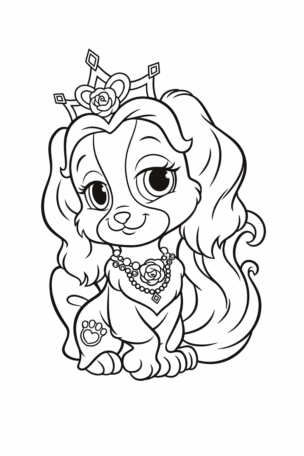 Ця чарівна розмальовка для дівчат зображує милого песика-принцесу з розкішним волоссям, короною та намистом. Малюнок виглядає надзвичайно ніжно й привабливо для маленьких художниць, які обожнюють тварин і казкові образи. Малюнок розмальовка допоможе розвивати уяву, дрібну моторику та посидючість. Ідеальна розфарбовка для дівчаток віком від 3 до 10 років. Ви можете легко скачати та роздрукувати в форматі А4, щоб одразу розпочати творчий процес.
