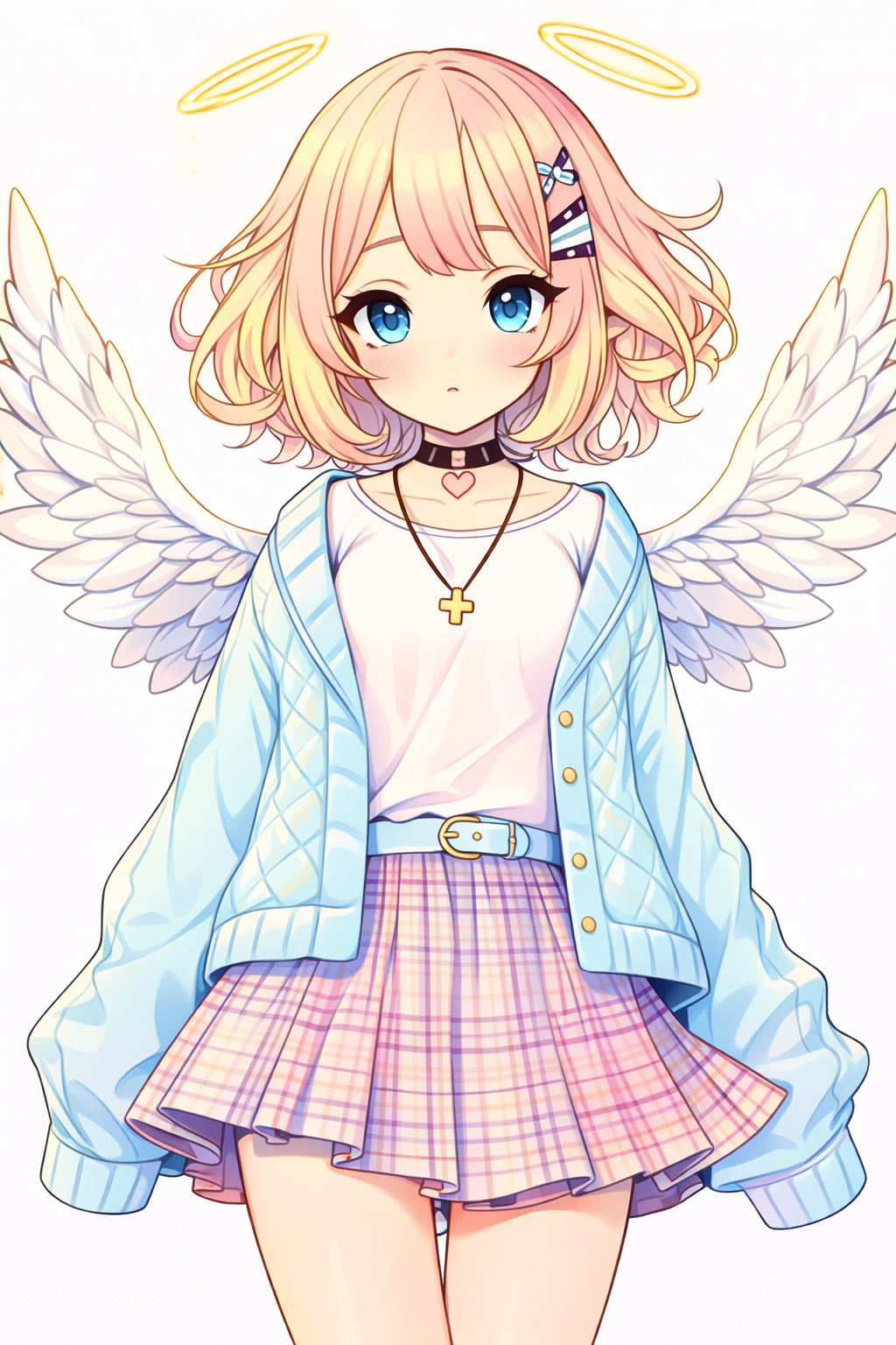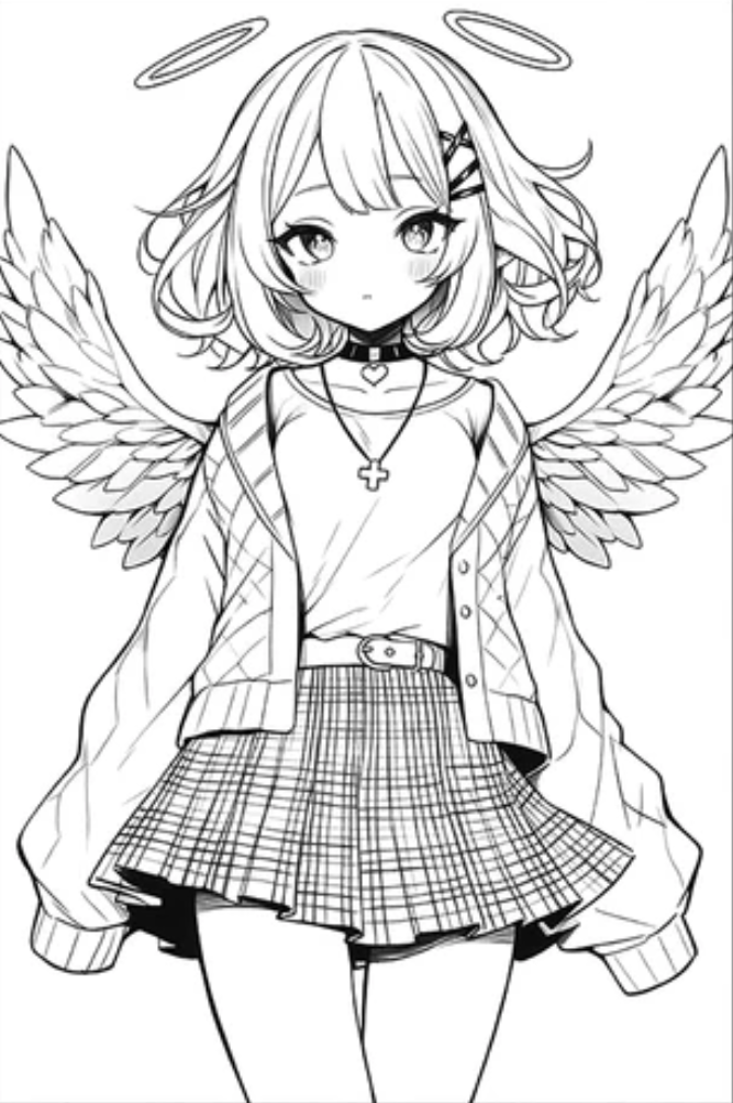 Ніжна та стильна розфарбовка із зображенням аніме дівчини-янгола з крилами та німбом подарує натхнення та спокій. Цей витончений малюнок розмальовка поєднує у собі красу, фантазію та сучасний стиль. Розфарбовка чудово підходить для підлітків і дорослих, допомагаючи розвивати уяву, творчість і увагу до деталей. Малюнок розмальовка містить багато цікавих елементів — крила, одяг і аксесуари, що робить процес розфарбовування захопливим. Ви можете легко скачати та роздрукувати розфарбовку у форматі А4 для приємного відпочинку.