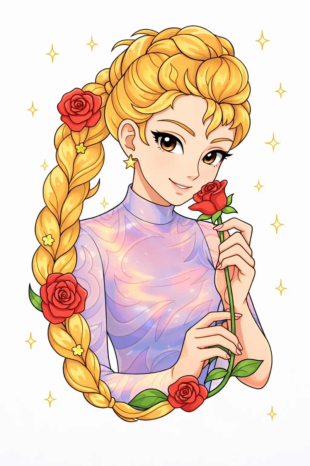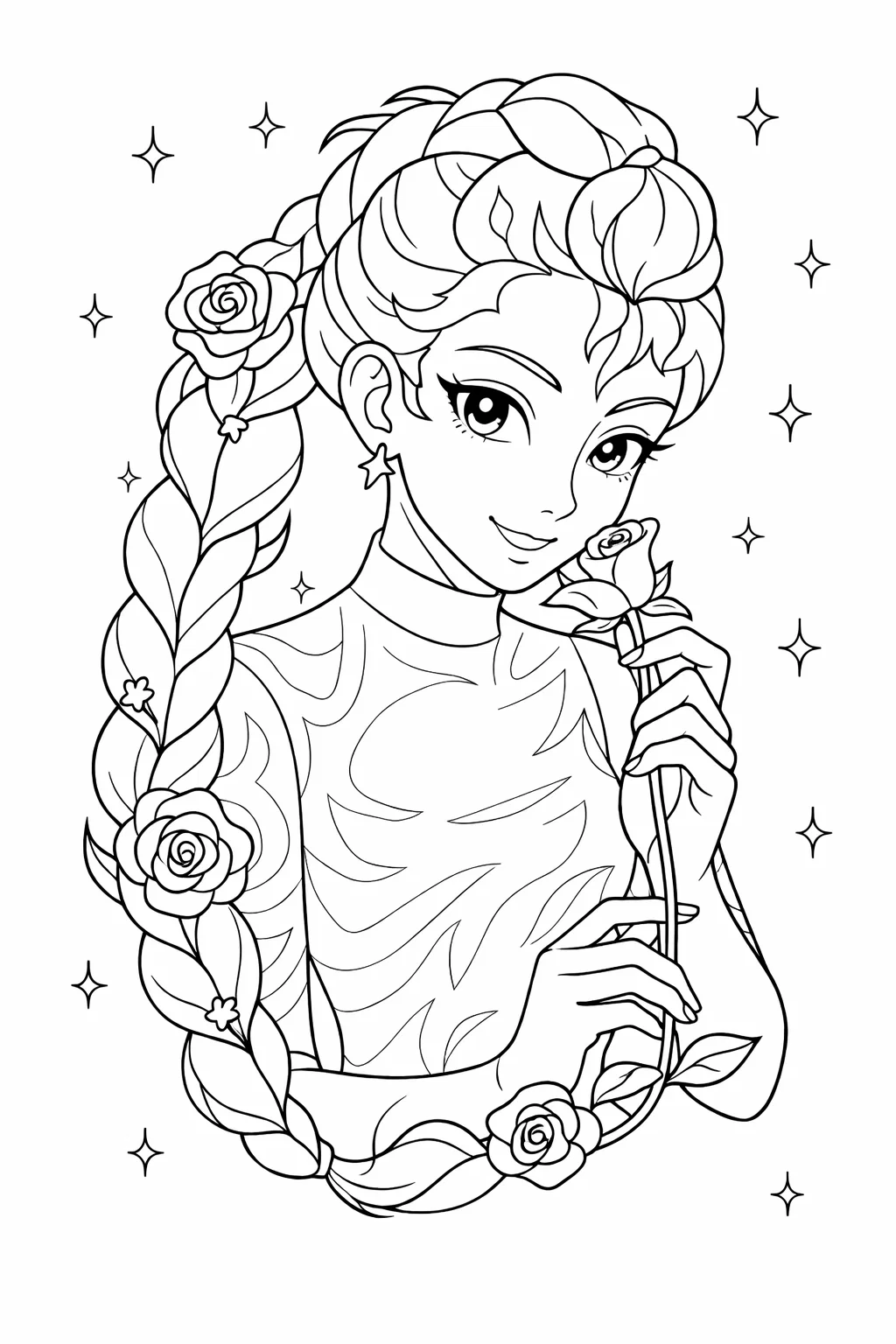 Ніжна розфарбовка із зображенням аніме дівчини з трояндою стане чудовим вибором для творчого дозвілля. Цей витончений малюнок розмальовка передає красу, жіночність і романтичний настрій. Дівчина з довгою косою, прикрашеною квітами, виглядає чарівно та елегантно. Розфарбовка допомагає розвивати уяву, художні навички та уважність до деталей. Малюнок розмальовка має чіткі контури, що ідеально підходять для розфарбовування олівцями чи фломастерами. Ви можете легко скачати та роздрукувати розфарбовку у форматі А4 для дітей і дорослих.