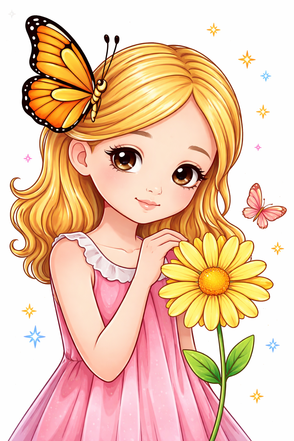 Ніжна розфарбовка із зображенням милої дівчинки з великим метеликом у волоссі та квіткою в руках подарує дітям радість творчості. Цей гармонійний малюнок розмальовка поєднує красу природи та дитячу ніжність, створюючи атмосферу спокою і фантазії. Розфарбовка допомагає розвивати уяву, дрібну моторику та художні здібності. Малюнок розмальовка має чіткі контури, що ідеально підходять для розфарбовування олівцями або фломастерами. Ви можете скачати та роздрукувати цю розфарбовку у форматі А4 для цікавого та корисного дозвілля.