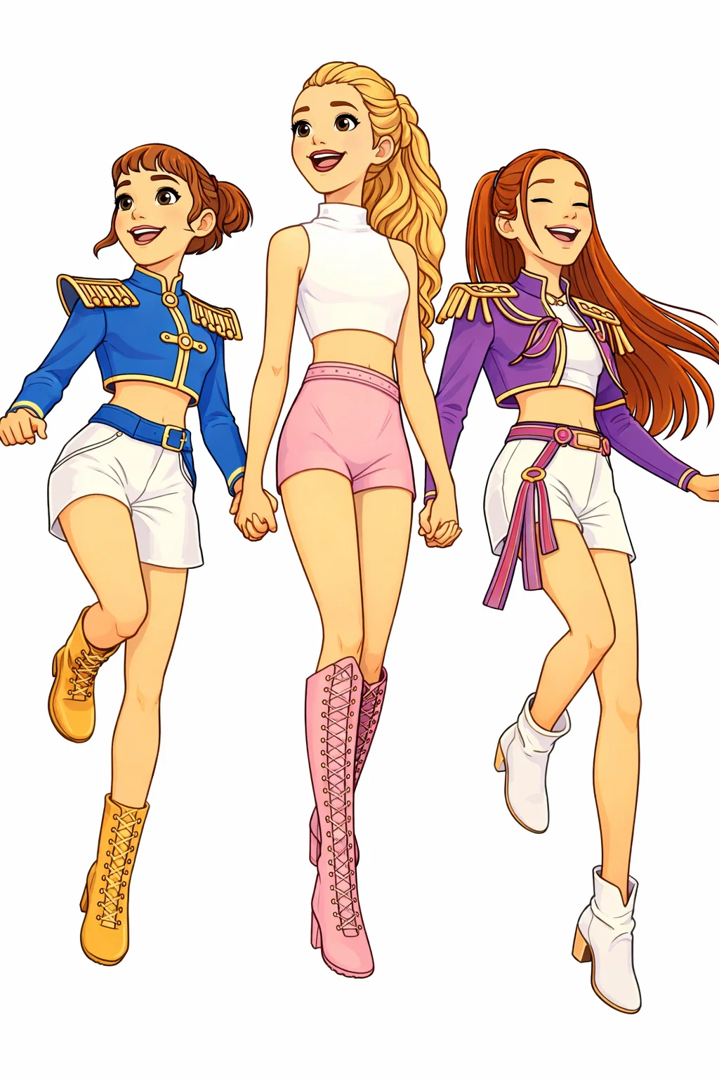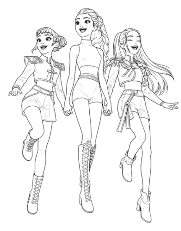 Яскрава розфарбовка із зображенням трьох веселих подруг, які співають і танцюють, чудово підійде для творчого відпочинку дітей. Цей стильний малюнок розмальовка передає рух, радість і дружбу, надихаючи на створення яскравих кольорових образів. Розфарбовка допомагає розвивати уяву, відчуття стилю та художні навички. Малюнок розмальовка має чіткі контури, що дозволяє легко розфарбовувати його олівцями чи фломастерами. Ви можете скачати та роздрукувати цю розфарбовку у форматі А4 для цікавого дозвілля вдома чи в школі.