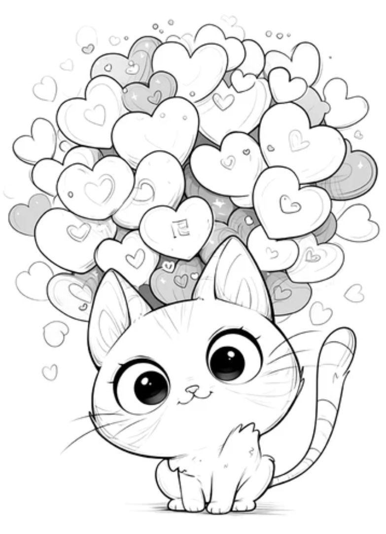 Чарівна розфарбовка з милим кошеням і безліччю сердечок створює атмосферу любові та радості. Цей ніжний малюнок розмальовка ідеально підходить для дітей та всіх, хто любить милі ілюстрації. Розфарбовка допомагає розвивати творчість, уяву та дрібну моторику, адже містить багато цікавих деталей — великі очі кошеняти та повітряні сердечка. Малюнок розмальовка має чіткі контури, що робить його зручним для розфарбовування олівцями, фломастерами чи фарбами. Ви можете легко скачати та роздрукувати розфарбовку у форматі А4 для приємного дозвілля.