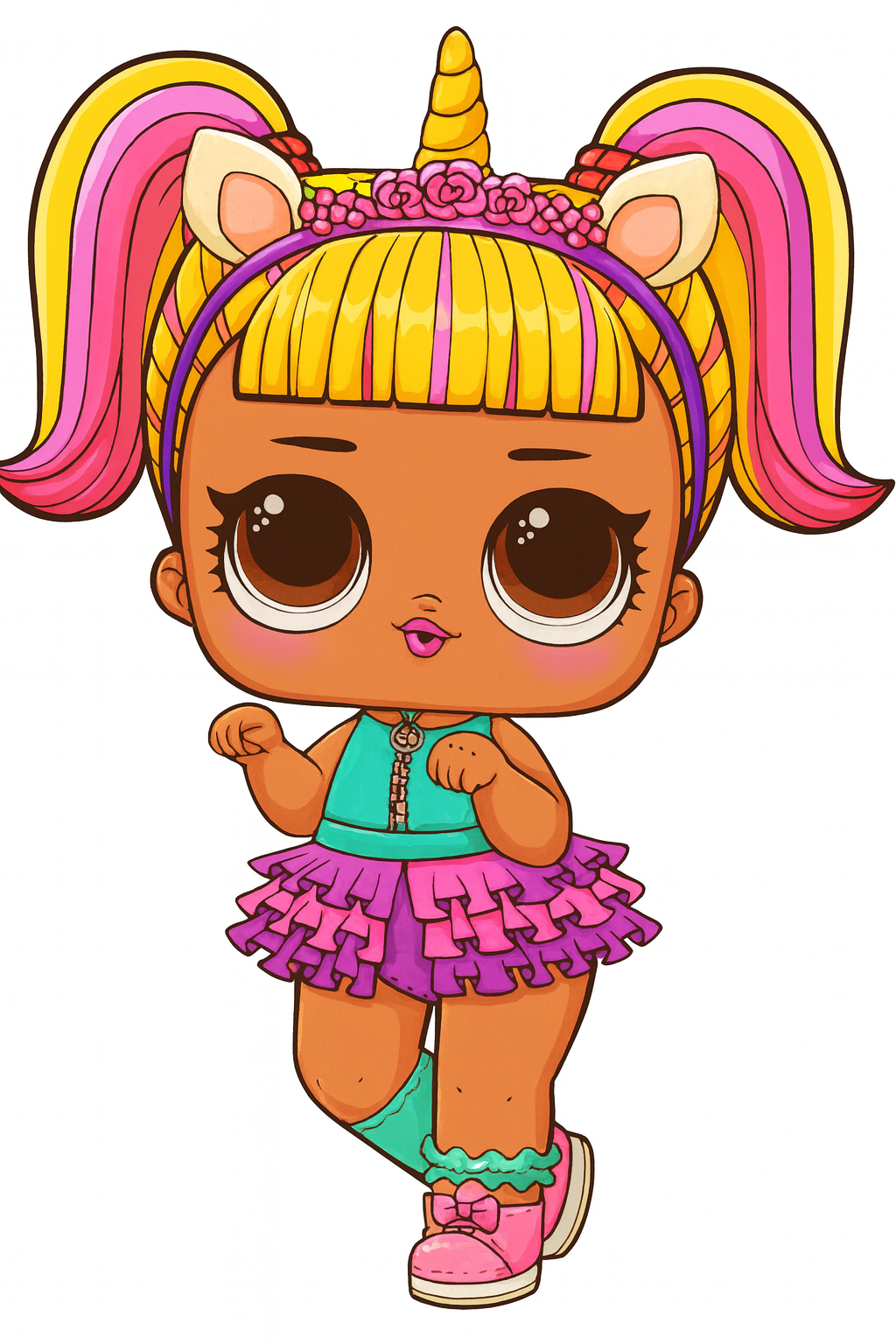 Ця розфарбовка з чарівною лялькою Лол єдиноріжкою подарує дітям справжню казку! Малюнок розмальовка допоможе розвивати фантазію, уважність і творчі навички. Дівчаткам буде цікаво розфарбовувати милу героїню з великими очима, пишною спідничкою та обручем із ріжком. Розфарбовка підходить для дітей різного віку, адже її легко роздрукувати у форматі А4 та розмалювати кольоровими олівцями чи фломастерами. Такий малюнок розмальовка стане чудовим вибором для дозвілля, розвитку та гарного настрою.