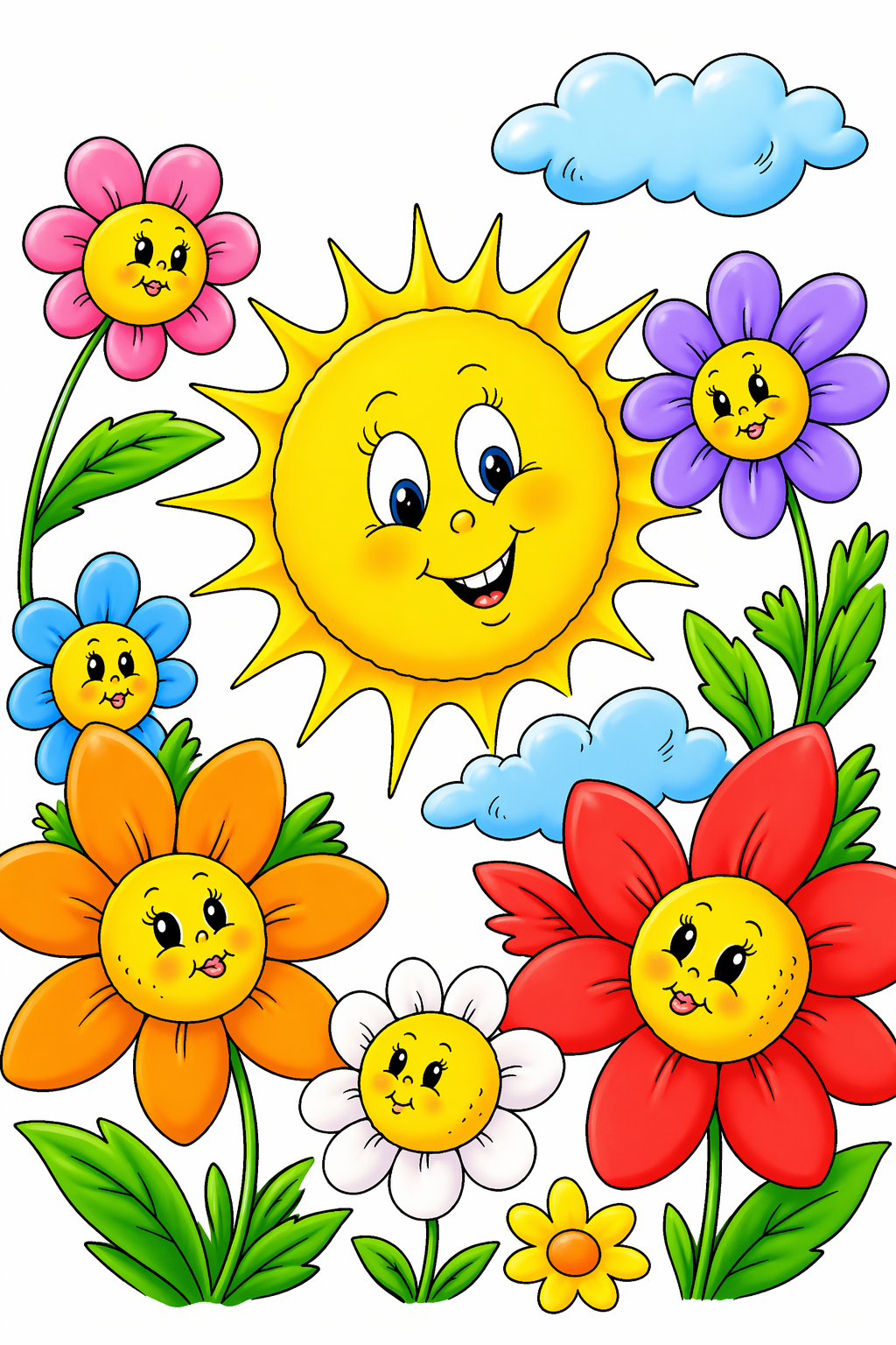 Яскрава та позитивна розфарбовка «Веселе сонечко серед квітів» подарує гарний настрій дітям будь-якого віку. Цей милий малюнок розмальовка зображає усміхнене сонце, оточене чарівними квітами з веселими обличчями. Розфарбовка допомагає розвивати уяву, творчі навички та дрібну моторику, адже має прості та чіткі контури. Малюнок розмальовка чудово підходить для розфарбування олівцями, фломастерами або фарбами, дозволяючи створити яскраву літню картинку. Ви можете легко скачати та роздрукувати розфарбовку у форматі А4 для веселого та корисного дозвілля.