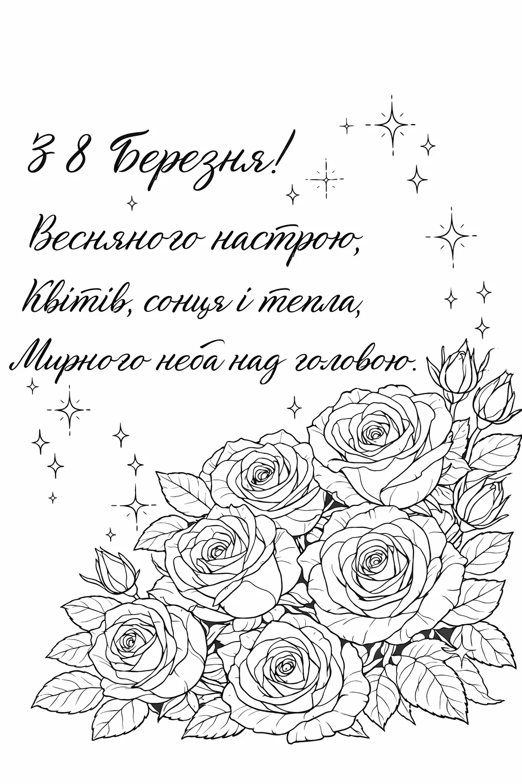 Ніжна розфарбовка до 8 Березня з розкішним букетом троянд і теплим весняним вітанням стане чудовою ідеєю для творчого відпочинку та створення святкового настрою. Цей малюнок розмальовка допомагає розвивати уважність, дрібну моторику, естетичний смак і фантазію. Розфарбовка підходить як для дітей старшого віку, так і для дорослих, які цінують спокій та натхнення. Малюнок розмальовка можна використати як оригінальну листівку для мами, бабусі чи близької людини. Файл легко скачати та роздрукувати у форматі А4 для домашнього або шкільного використання.