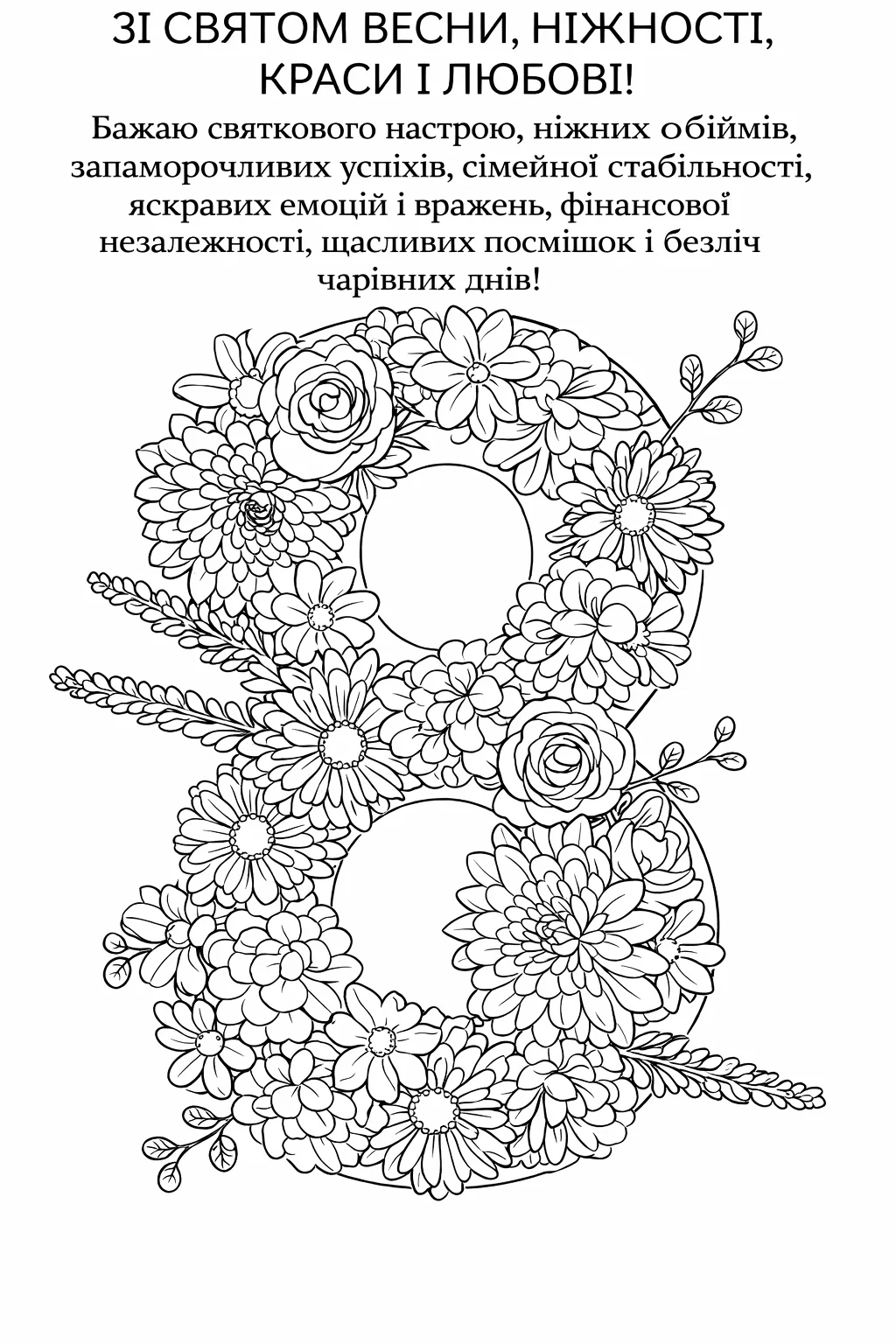 Витончена розфарбовка до 8 Березня у вигляді квіткової цифри вісім із теплим вітальним текстом створена спеціально для дорослих. Детальний малюнок розмальовка з квітами допомагає розслабитися, зняти стрес і поринути у творчий процес. Така розфарбовка чудово підходить для арттерапії, медитації та створення унікальної святкової листівки власноруч. Малюнок розмальовка стане гарним подарунком для мами, бабусі чи коханої людини. Сторінку легко скачати та роздрукувати в форматі А4 для домашнього або творчого використання.