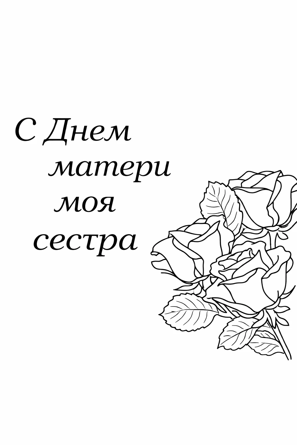 Красива святкова розфарбовка до Дня матері з написом «З Днем матері, моя сестро» та ніжним букетом троянд стане чудовою ідеєю для вітальної листівки. Такий малюнок розмальовка дозволяє створити особливе привітання для сестри, яка стала мамою. Розфарбовка допомагає дітям і дорослим проявити творчість, адже квіти можна розфарбувати у яскраві або ніжні кольори. Малюнок розмальовка розвиває уяву, уважність і дрібну моторику. Цю розфарбовку легко скачати та роздрукувати у форматі А4, щоб зробити гарний подарунок до Дня матері власними руками.