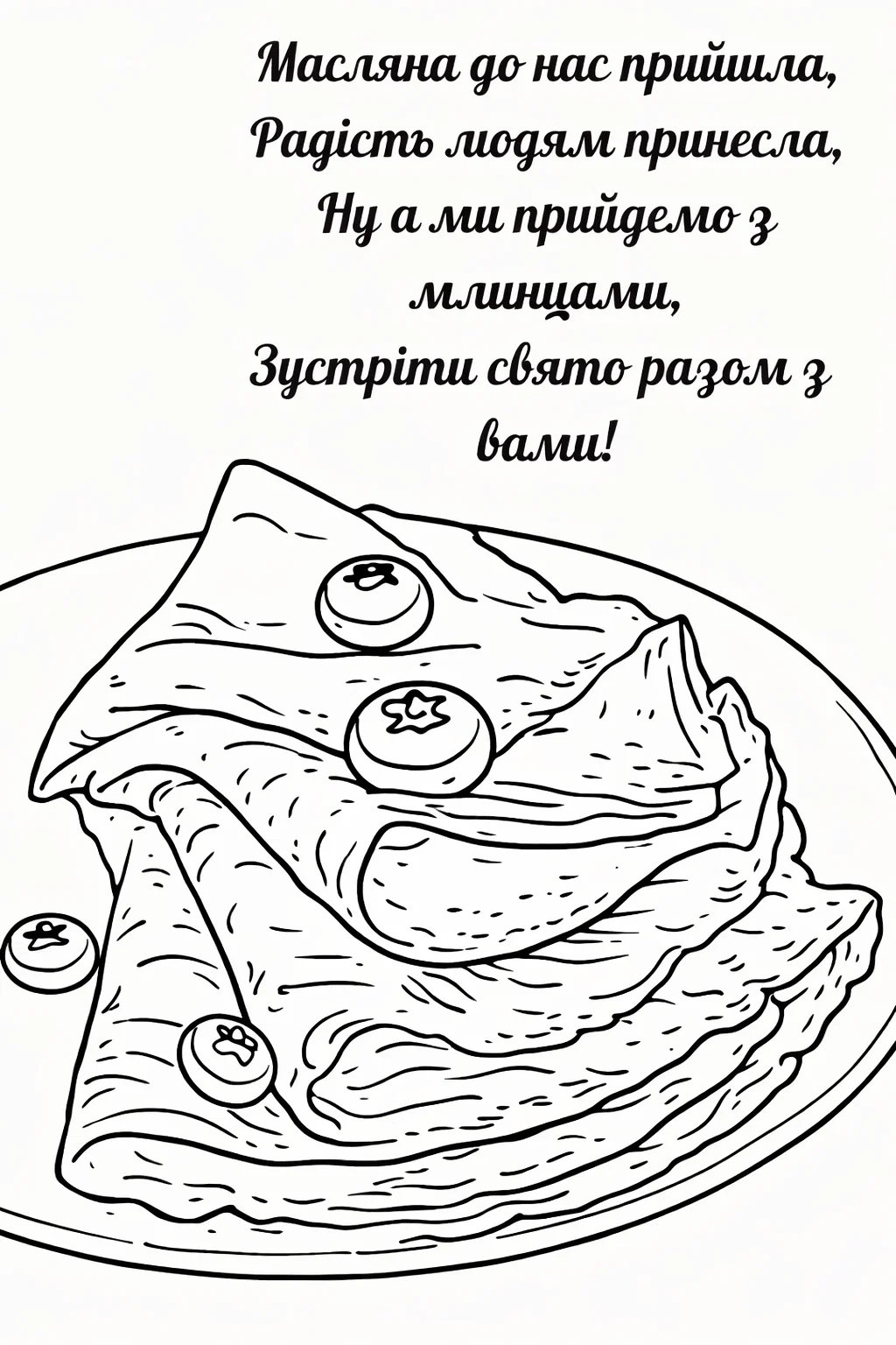 Ця розмальовка для дорослих присвячена яскравому та теплому святу Масляна. На зображенні — апетитні млинці, викладені на тарілці, та святковий вірш, що створює атмосферу радості, затишку й народних традицій. Така розфарбовка чудово підходить для творчого відпочинку, зняття стресу та натхнення. Малюнок розмальовка можна використовувати як для медитативного розфарбовування, так і для декору до свята. Розфарбовка легко друкується, має чіткі контури та ідеально підходить для формату А4, щоб насолоджуватися творчістю вдома.