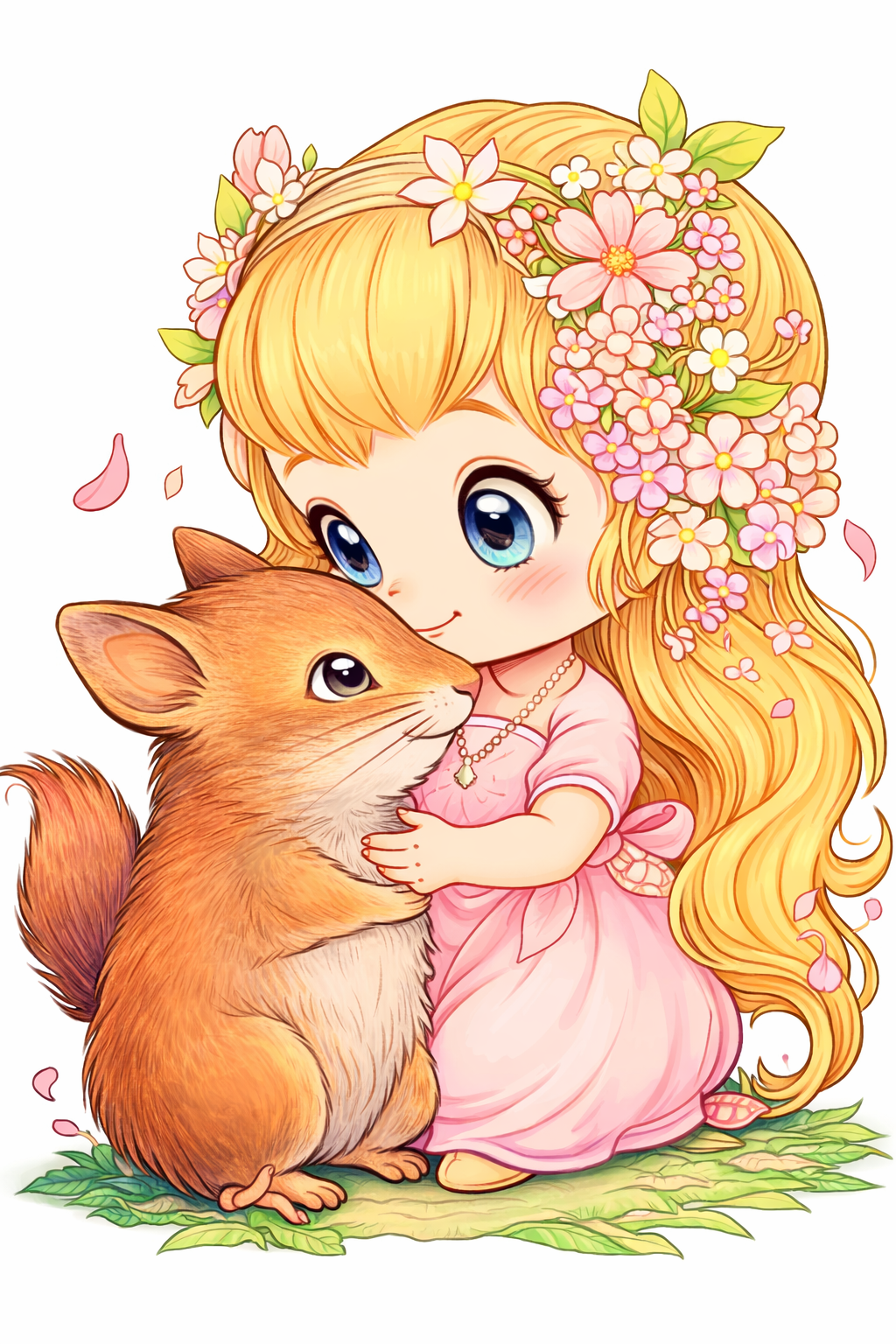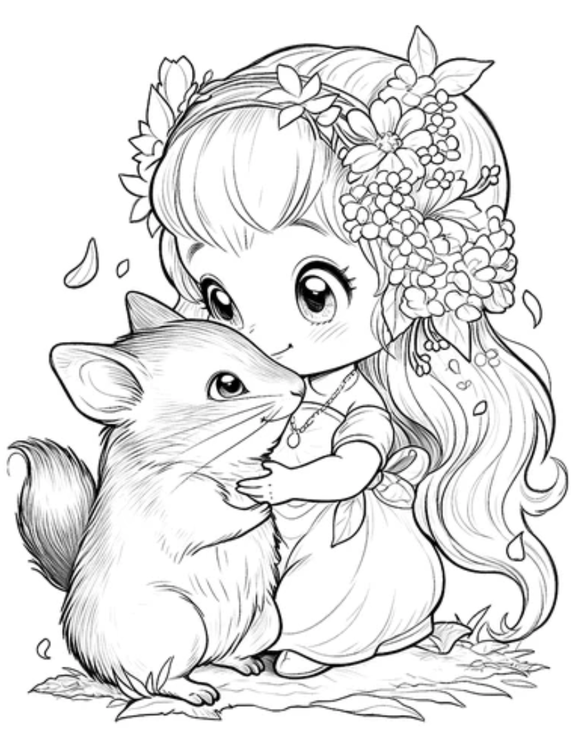 Ніжна розфарбовка із зображенням маленької дівчинки з квітами у волоссі та милим лисеням створює атмосферу тепла й казки. Цей чарівний малюнок розмальовка чудово підходить для дітей, допомагаючи розвивати фантазію, творчість і любов до природи. Розфарбовка має багато цікавих деталей — квіти, листя та пухнастого звірятка, що робить процес розфарбовування ще захопливішим. Малюнок розмальовка виконаний з чіткими контурами, тому його зручно розфарбовувати олівцями чи фломастерами. Ви можете легко скачати та роздрукувати розфарбовку у форматі А4 для веселого дозвілля.