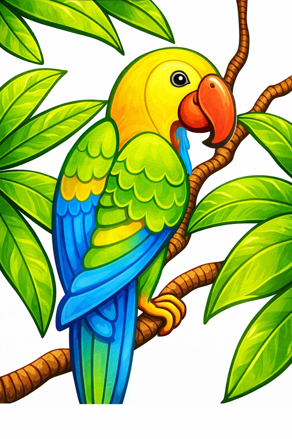 Яскрава розфарбовка «Папуга на гілці серед листя» стане чудовим вибором для творчих занять дітей і дорослих. Цей привабливий малюнок розмальовка зображає веселого папугу, який сидить на гілці серед великого листя. Розфарбовка допомагає розвивати уяву, уважність і дрібну моторику, адже має чіткі контури та цікаві деталі. Малюнок розмальовка підходить для олівців, фломастерів і фарб, дозволяючи створювати яскраві кольорові композиції. Ви можете легко скачати та роздрукувати розфарбовку у форматі А4 для захопливого та корисного дозвілля.