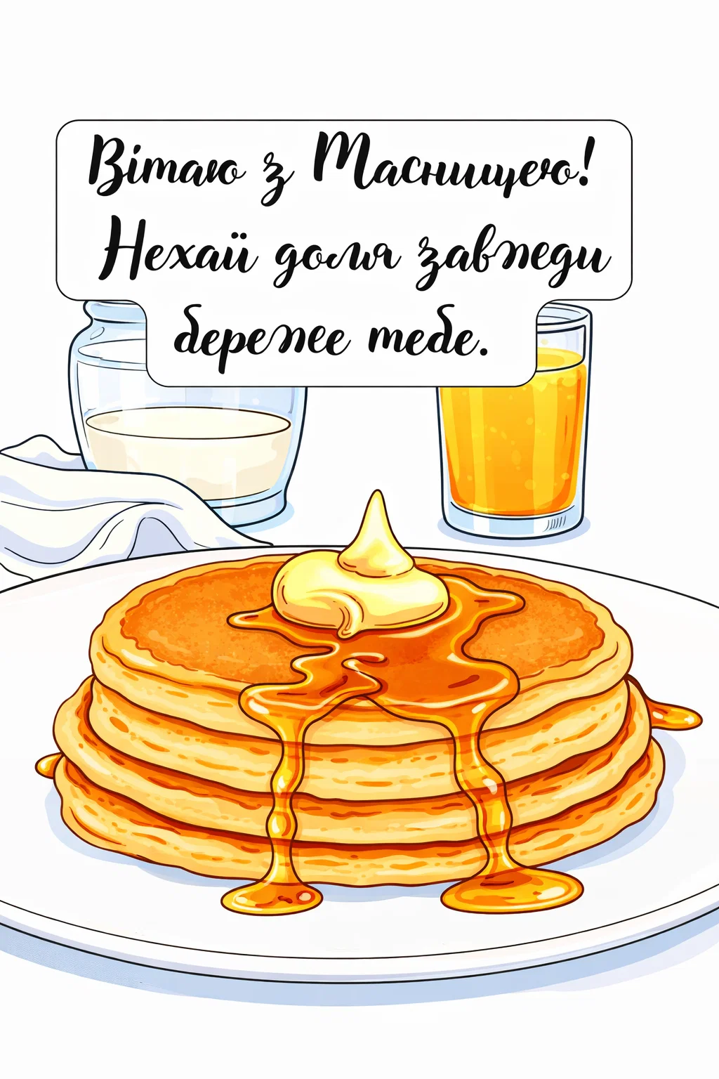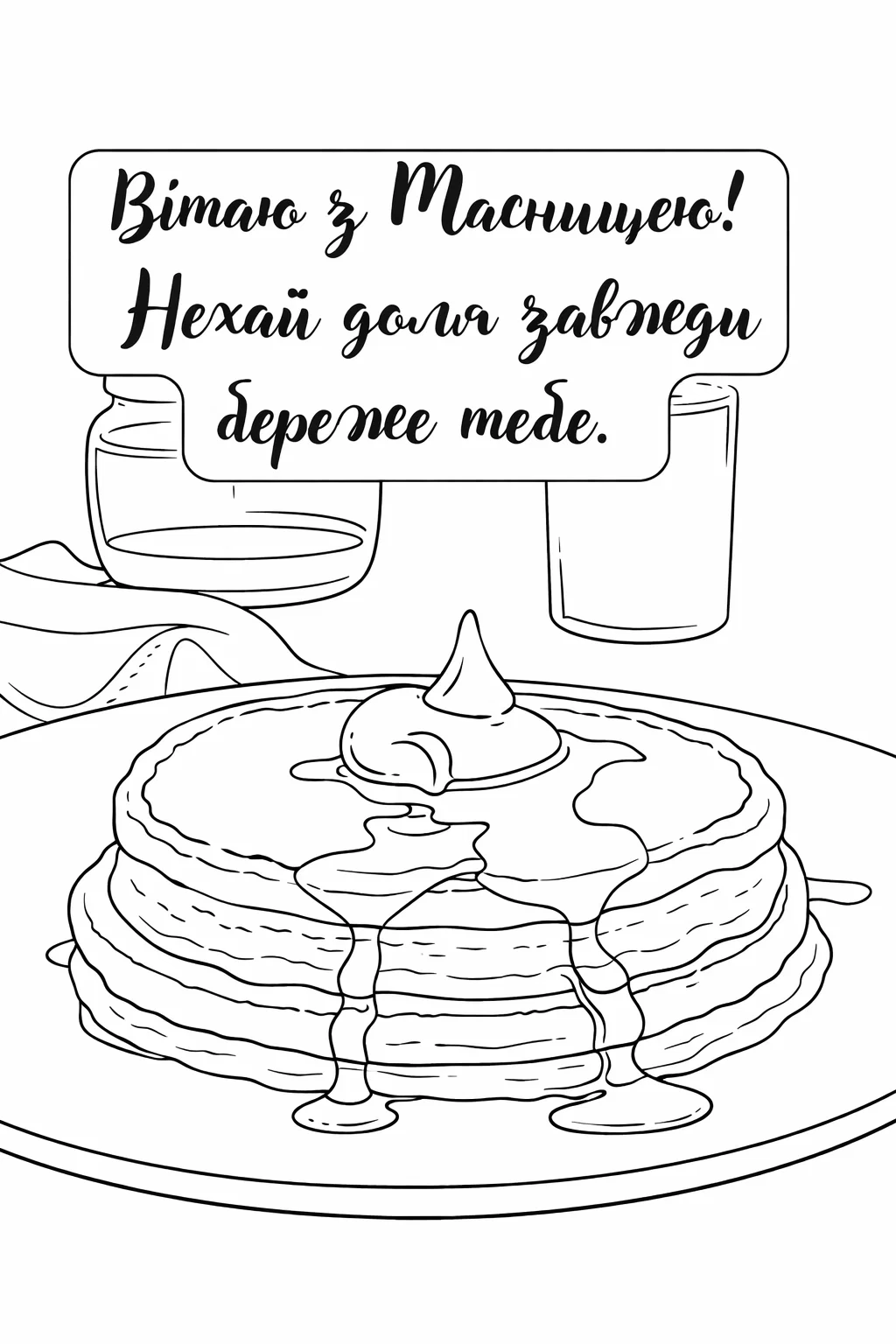 Ця атмосферна розмальовка для дорослих присвячена святу Масниці та теплим народним побажанням. Малюнок розмальовка з апетитною стопкою млинців, политих медом, та святковим написом створений у чорно-білому стилі з чіткими рівними контурами на світлому фоні, без штрихування й тіней. Така розфарбовка ідеально підходить для антистрес-творчості, медитативного відпочинку та натхнення. Малюнок розмальовка можна розфарбовувати олівцями, маркерами або ручками. Зображення легко скачати та роздрукувати у форматі А4 для домашніх занять і святкового настрою.
