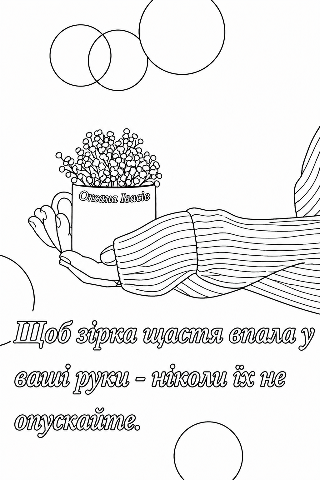 Ця ніжна розфарбовка з мотивуючим написом і затишною ілюстрацією стане чудовим вибором для відпочинку та творчості. Малюнок розмальовка із чашкою квітів у руках символізує тепло, турботу та віру у щастя. Така розфарбовка допоможе розслабитися, зняти напругу та створити власний кольоровий настрій. Підходить як для дорослих, так і для підлітків. Малюнок розмальовка можна легко скачати та роздрукувати, щоб насолоджуватися творчим процесом у будь-який час.