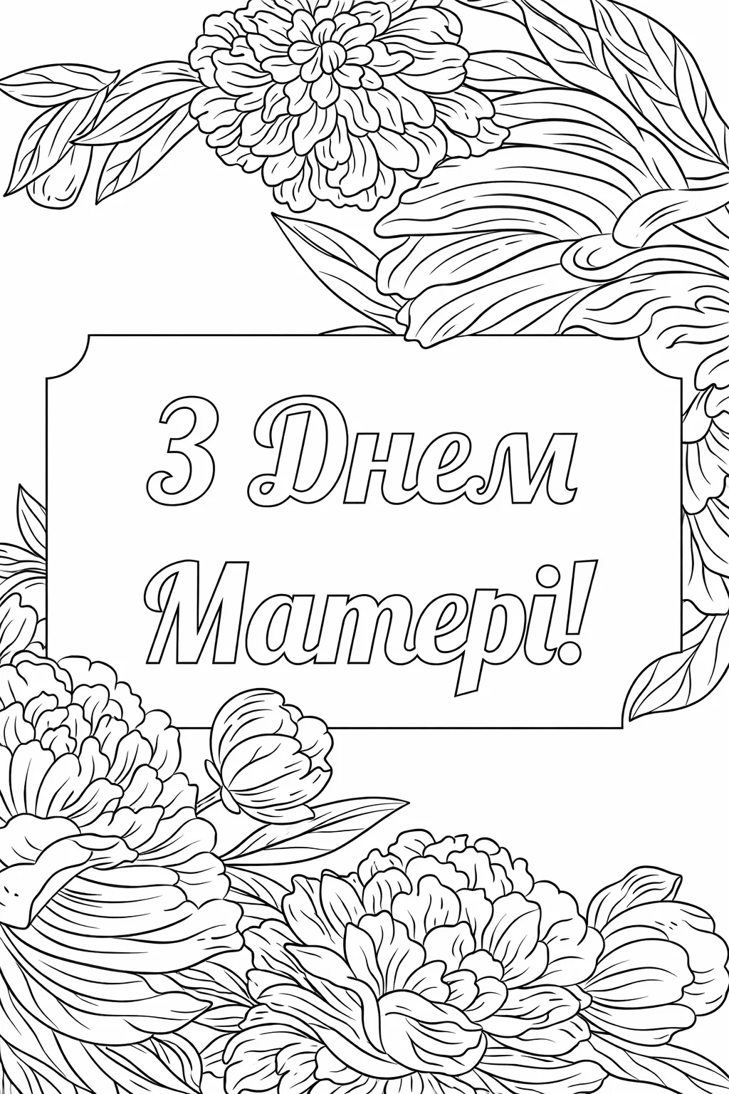Красива святкова розфарбовка до Дня матері з великим написом «З Днем Матері!» та декоративними квітами стане чудовою основою для створення вітальної листівки. Такий малюнок розмальовка прикрашений ніжними квітковими елементами, які можна розфарбувати у яскраві весняні кольори. Розфарбовка допоможе дітям підготувати особливий подарунок для мами власними руками. Малюнок розмальовка розвиває творче мислення, уяву та дрібну моторику. Цю розфарбовку легко скачати та роздрукувати у форматі А4 для занять у школі, дитячому садку або вдома.