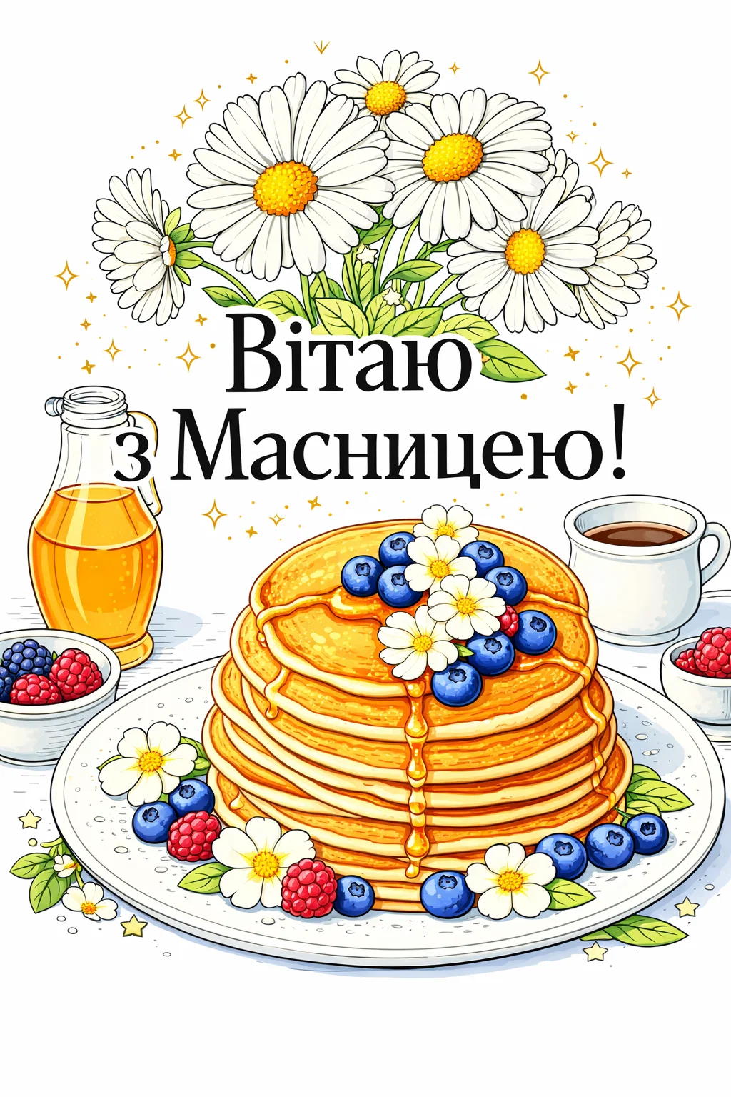 Ця святкова розмальовка до Масниці наповнена теплом, красою та атмосферою весняної радості. На малюнку зображені апетитні млинці з ягодами, квітами, медом і напоєм, а також напис «Вітаю з Масницею!», що створює відчуття домашнього затишку й щирого привітання. Розфарбовка чудово підходить для дітей і дорослих, допомагає розслабитися та насолодитися творчістю. Малюнок розмальовка має чіткі лінії, легко розфарбовується та підходить для святкових занять. Така розфарбовка стане гарною прикрасою до Масниці та творчим дозвіллям для всієї родини.