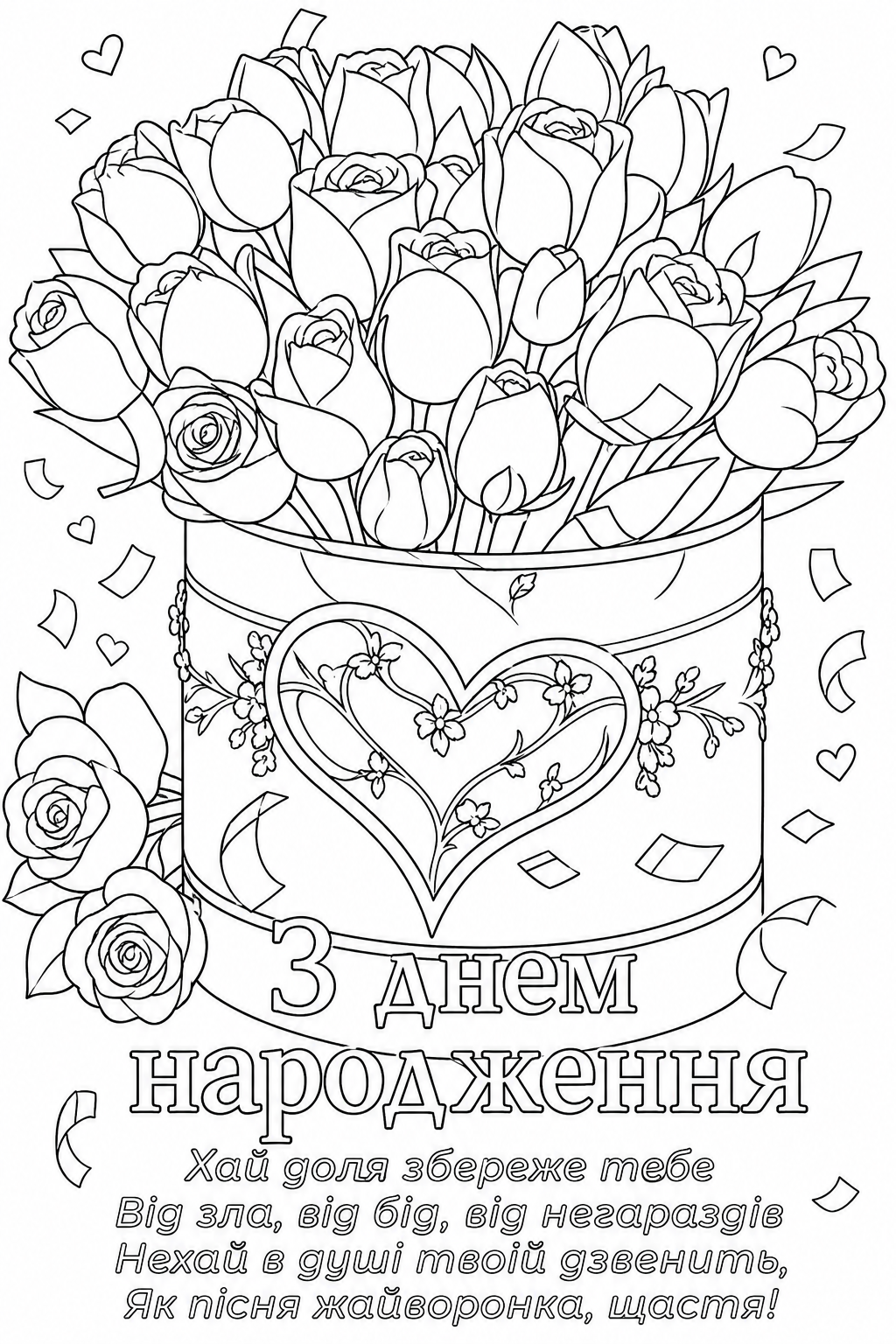 Святкова розфарбовка «З Днем народження! Букет квітів з побажаннями» — чудовий вибір для творчого дозвілля дітей і дорослих. Цей малюнок розмальовка зображує красивий букет троянд у декоративній коробці з ніжними візерунками та теплими словами привітання. Така розфарбовка допомагає розвивати фантазію, уважність і художні навички. Малюнок розмальовка має чіткі контури, тому його легко розфарбовувати олівцями, фарбами або фломастерами. Ви можете скачати розфарбовку та роздрукувати її у форматі А4, щоб створити яскраву листівку власноруч і подарувати гарний настрій.