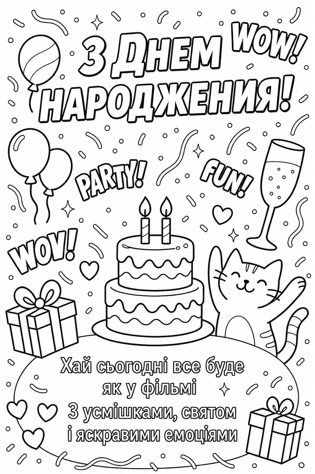 Весела розфарбовка з котиком, святковим тортом і подарунками створює яскравий настрій та атмосферу свята. Малюнок розмальовка з написом «З днем народження!» і милими деталями чудово підходить для дітей і дорослих. Така розфарбовка допомагає розвивати фантазію, уважність і дарує радість творчості. Малюнок розмальовка стане гарною ідеєю для створення власної листівки або прикраси до свята. Легко скачати та роздрукувати у форматі А4 для використання вдома, у школі чи на дитячій вечірці.