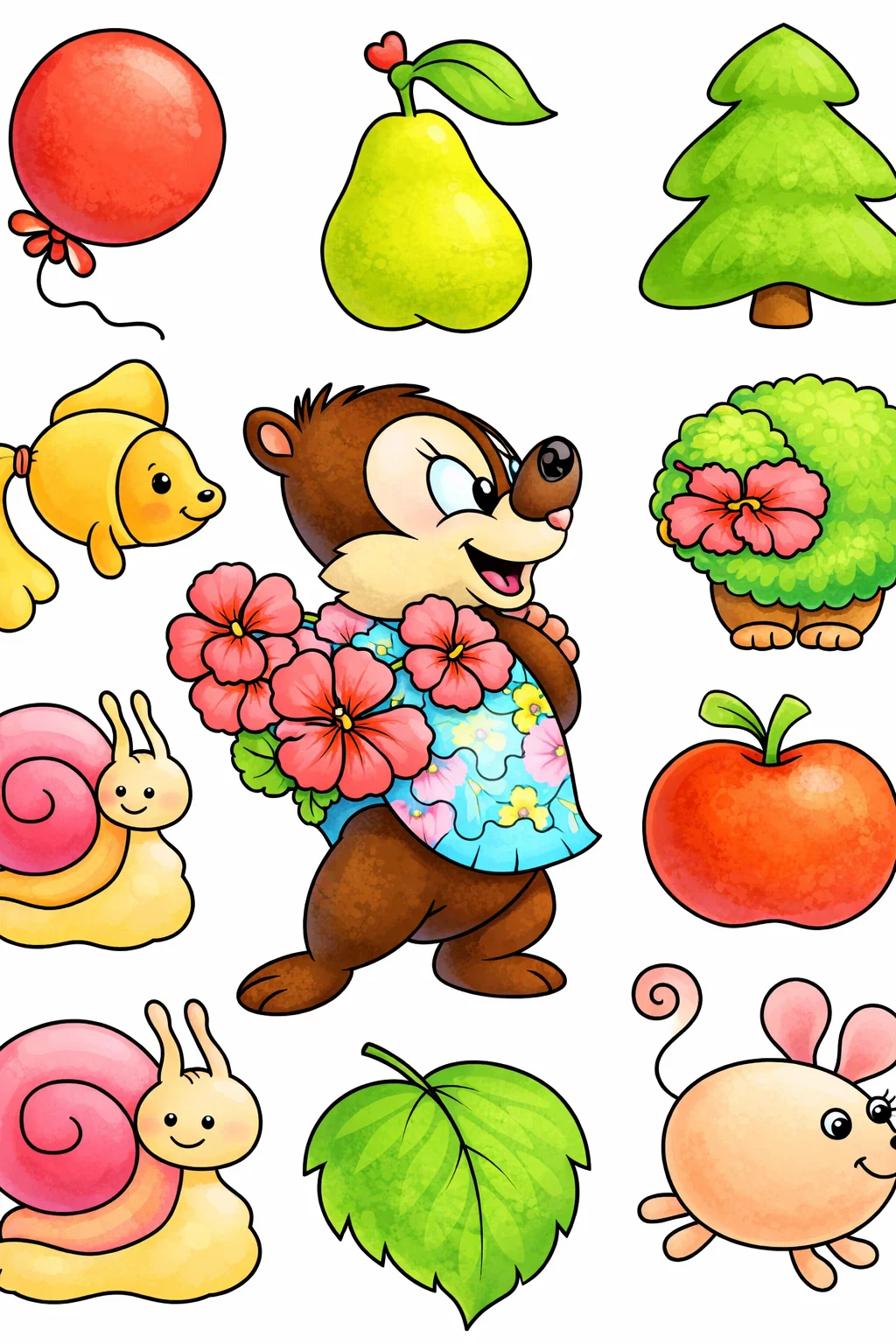 Яскрава та добра розмальовка у стилі дісней створена спеціально для маленьких дітей. На сторінці зібрані милі персонажі, тваринки, фрукти, рослини та прості предмети, які легко впізнати й цікаво розфарбовувати. Цей малюнок розмальовка має чіткі контури та великі елементи, що ідеально підходить для дитячих ручок. Розфарбовка допомагає розвивати дрібну моторику, фантазію, уважність і знайомить малюків з навколишнім світом у ігровій формі. Зображення можна легко скачати та роздрукувати у форматі А4 для занять удома чи в дитячому садку.