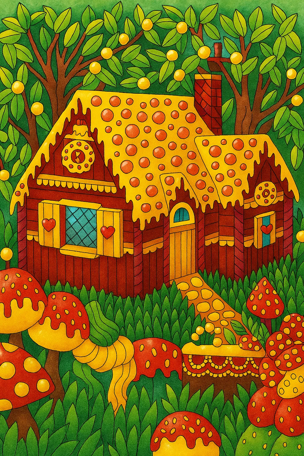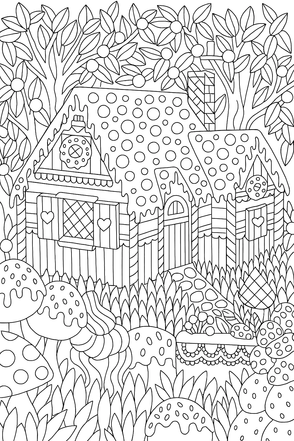 Малюнок розмальовка «Пряниковий будиночок у чарівному лісі» — казкова розфарбовка для дітей 10+ років, яка переносить у солодкий світ фантазій. Деталізований будиночок з прикрасами, ліс із листям, грибами, цукерками та пряниками створюють ідеальне поле для творчості. Така розмальовка розвиває уважність, дрібну моторику й креативність. Малюнок чудово підійде для школярів, підлітків і навіть дорослих, які полюбляють розфарбовки з великою кількістю дрібних елементів. Завантажуйте безкоштовно у форматі А4, роздрукуйте й пориньте у світ розмальовування!