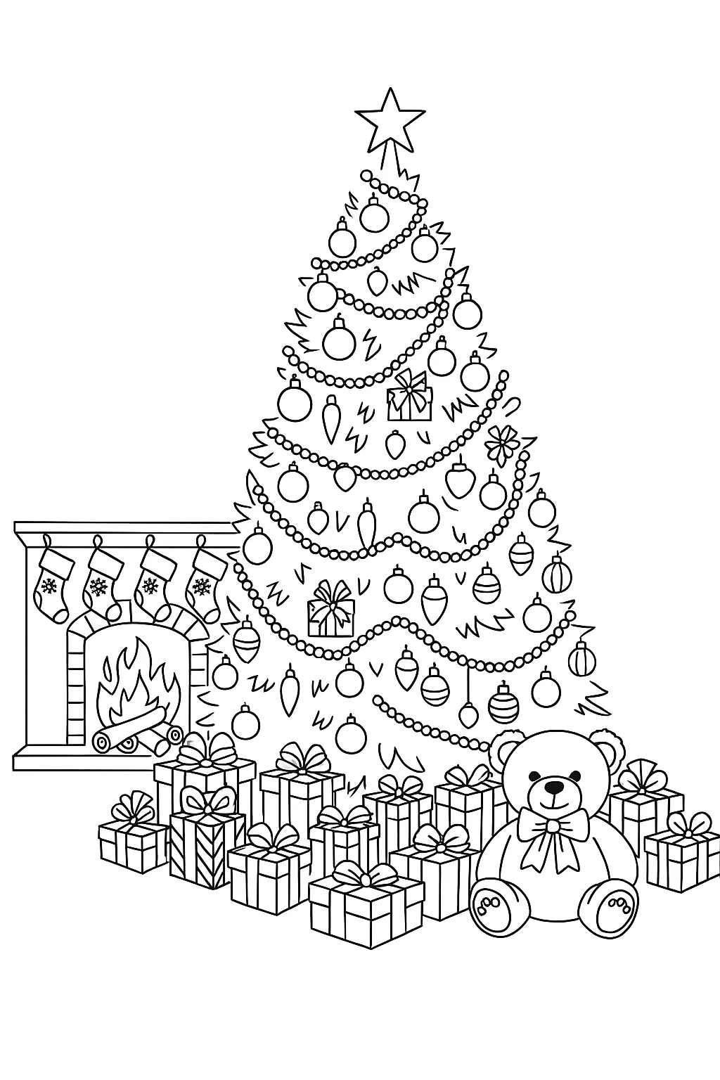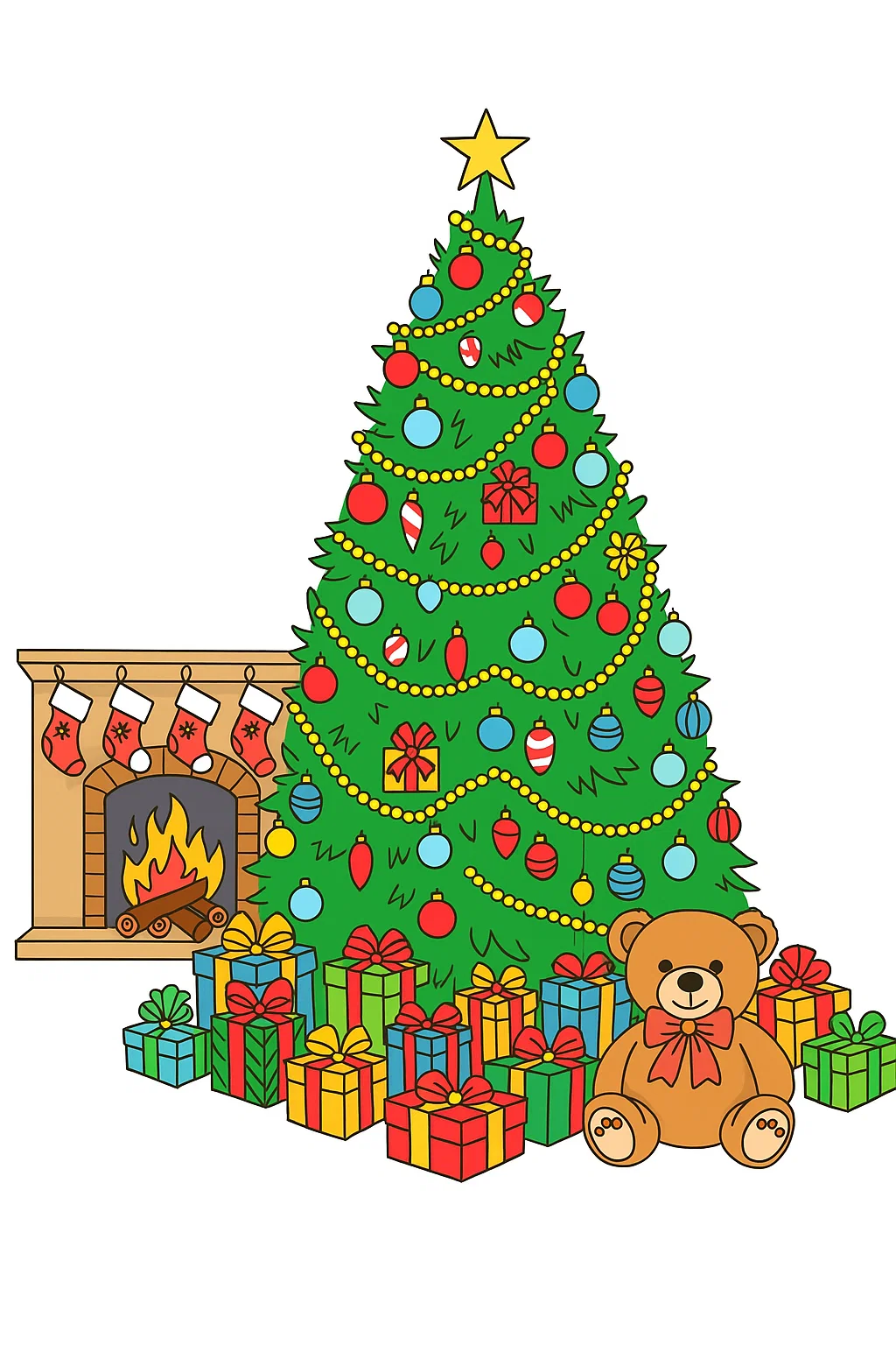 Малюнок розмальовка «Новорічна ялинка з подарунками та каміном» — ідеальна святкова розфарбовка для дітей 10 + років, яка створює атмосферу тепла й чарівного очікування. Яскраво прикрашена ялинка, камін із палаючим вогнем, мішечки для подарунків та іграшковий ведмедик — усе це дарує натхнення до творчості. Розфарбовка сприяє розвитку дрібної моторики, уяви та кольорового мислення. Малюнок розмальовка чудово підійде для зимових вечорів і занять у школі чи вдома. Завантажте та роздрукуйте у форматі А4 абсолютно безкоштовно!