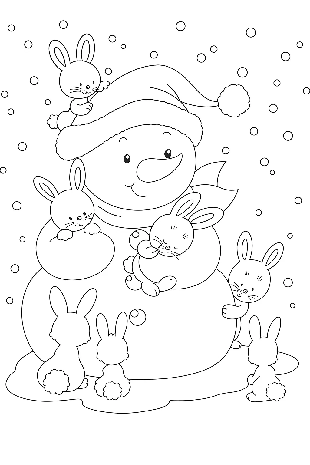 Малюнок розмальовка «Сніговик і зайченята в зимову пору» — чудова зимова розфарбовка для дітей 10+ років, яка створює теплий святковий настрій. На малюнку сніговик у шапці та шарфику оточений милими зайченятами серед снігу. Ця розмальовка чудово розвиває дрібну моторику, уважність і фантазію. Деталі зображення дозволяють проявити творчість навіть старшим дітям і дорослим. Завантажте розфарбовку безкоштовно у форматі А4, роздрукуйте її та подаруйте собі або дитині цікаве творче заняття в атмосфері зимової казки.