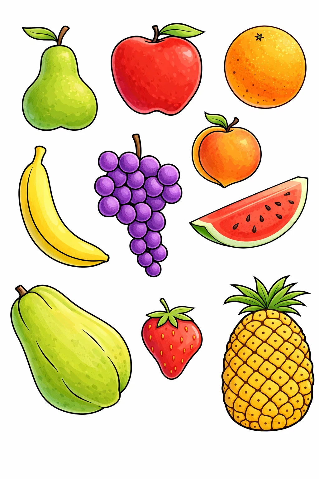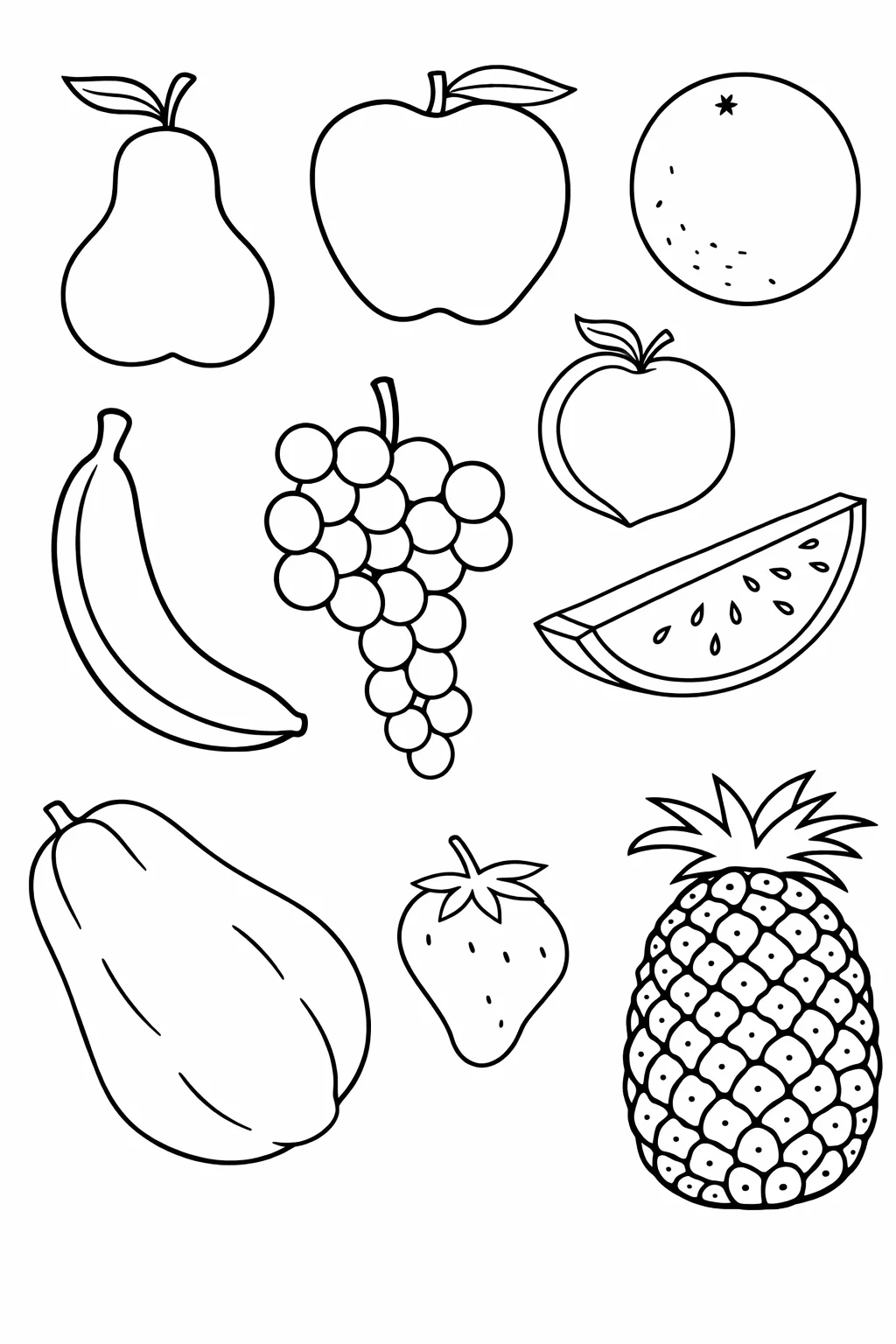Яскрава та пізнавальна розмальовка для дітей із набором фруктів і ягід стане чудовим варіантом для корисного дозвілля. На сторінці зображені знайомі плоди: яблуко, груша, банан, виноград, ананас, полуниця та кавун. Такий малюнок розмальовка допомагає дітям вивчати фрукти, розвивати уяву, дрібну моторику й уважність. Розфарбовка підходить для занять удома, у дитячому садку або школі. Картинку легко скачати та роздрукувати у форматі А4, щоб дитина могла із задоволенням творити та навчатися через гру.