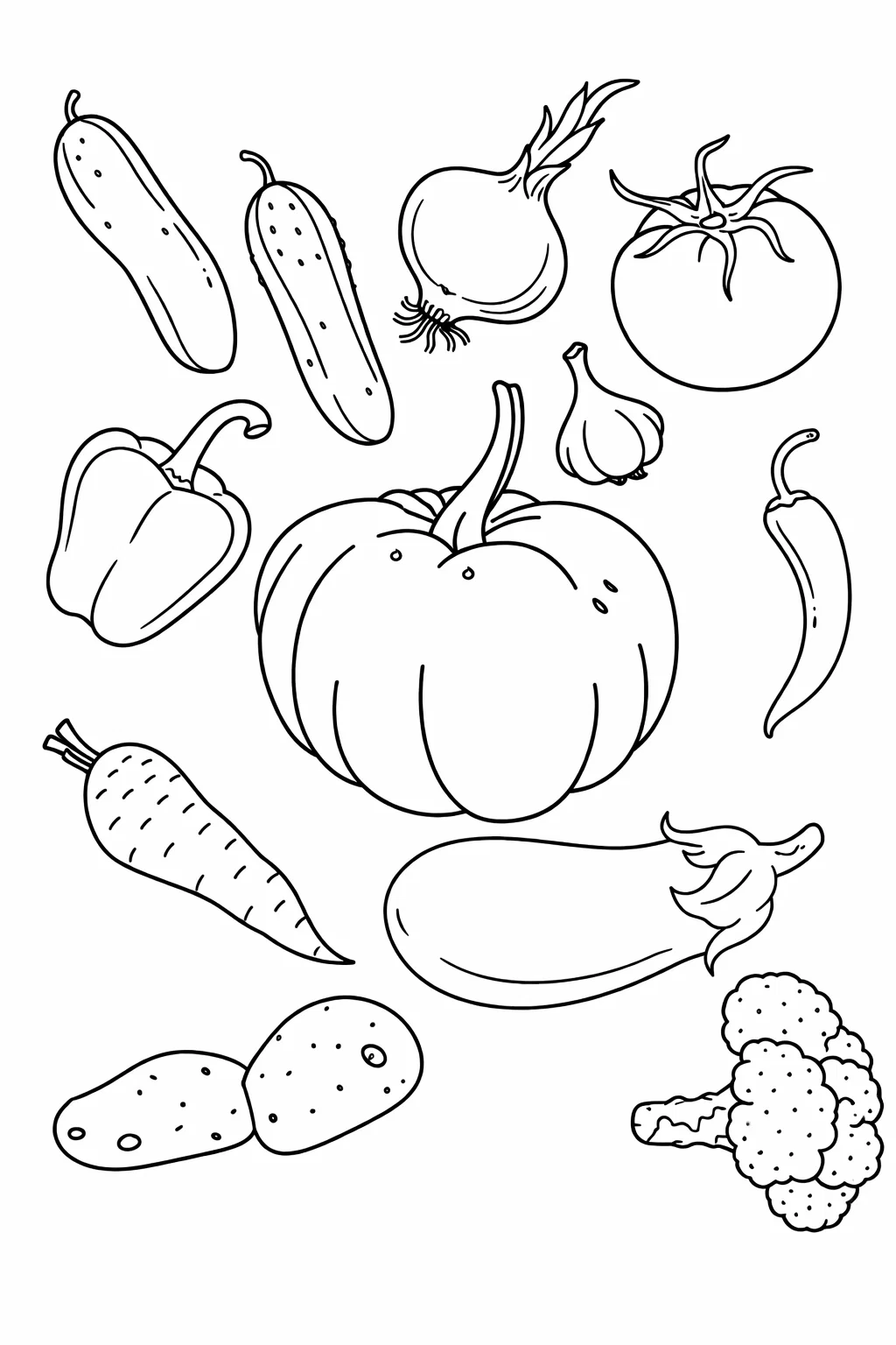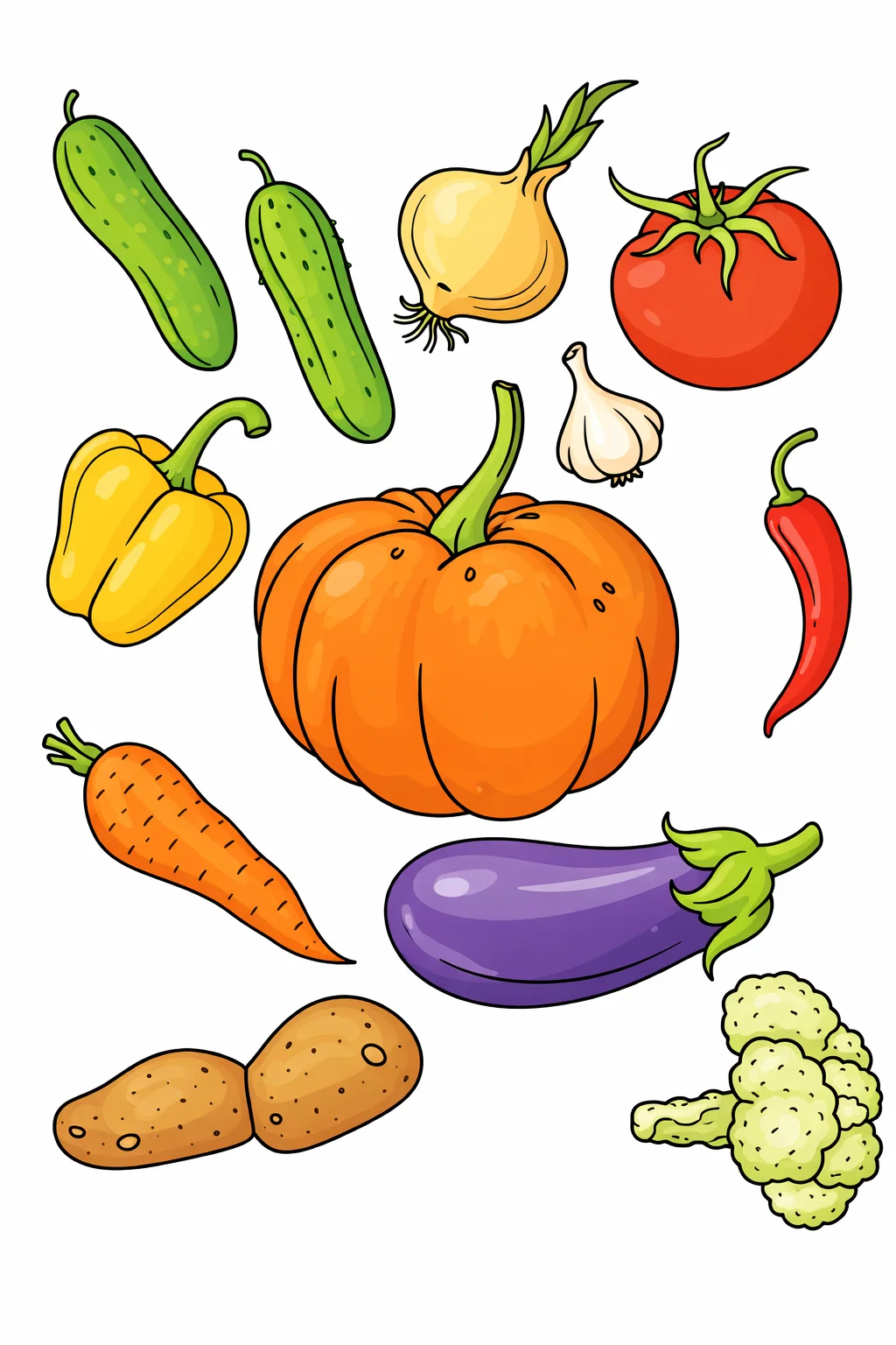 Навчальна та цікава розмальовка для дітей із зображенням овочів допоможе поєднати гру та навчання. На цьому аркуші представлені гарбуз, огірки, помідор, морква, картопля, перець, баклажан, цибуля та броколі. Такий малюнок розмальовка знайомить дітей з овочами, розвиває уважність, дрібну моторику та уяву. Розфарбовка підходить для занять удома, у дитячому садку або початковій школі. Зображення легко скачати та роздрукувати у форматі А4, щоб дитина із задоволенням навчалась через творчість.