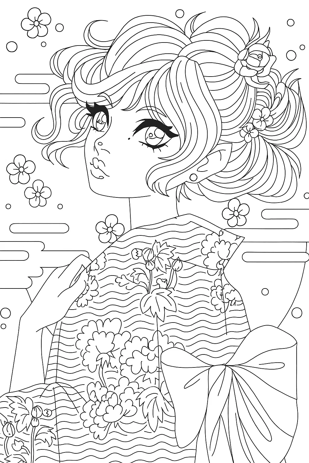 Розмальовки для дівчат аніме дівчина — чудова розфарбовка для всіх, хто обожнює японський стиль малюнків. Цей детальний малюнок розмальовка із чарівною героїнею в кімоно допоможе проявити творчість і розслабитися під час розфарбовування. Розфарбовка підходить як для дітей, так і для дорослих, адже вимагає уважності до дрібних деталей і дозволяє створити власну кольорову історію. Використовуйте яскраві кольори, щоб надати зображенню життя! Розфарбовку можна безкоштовно скачати та роздрукувати у форматі А4.