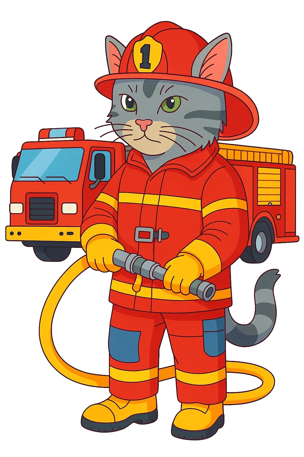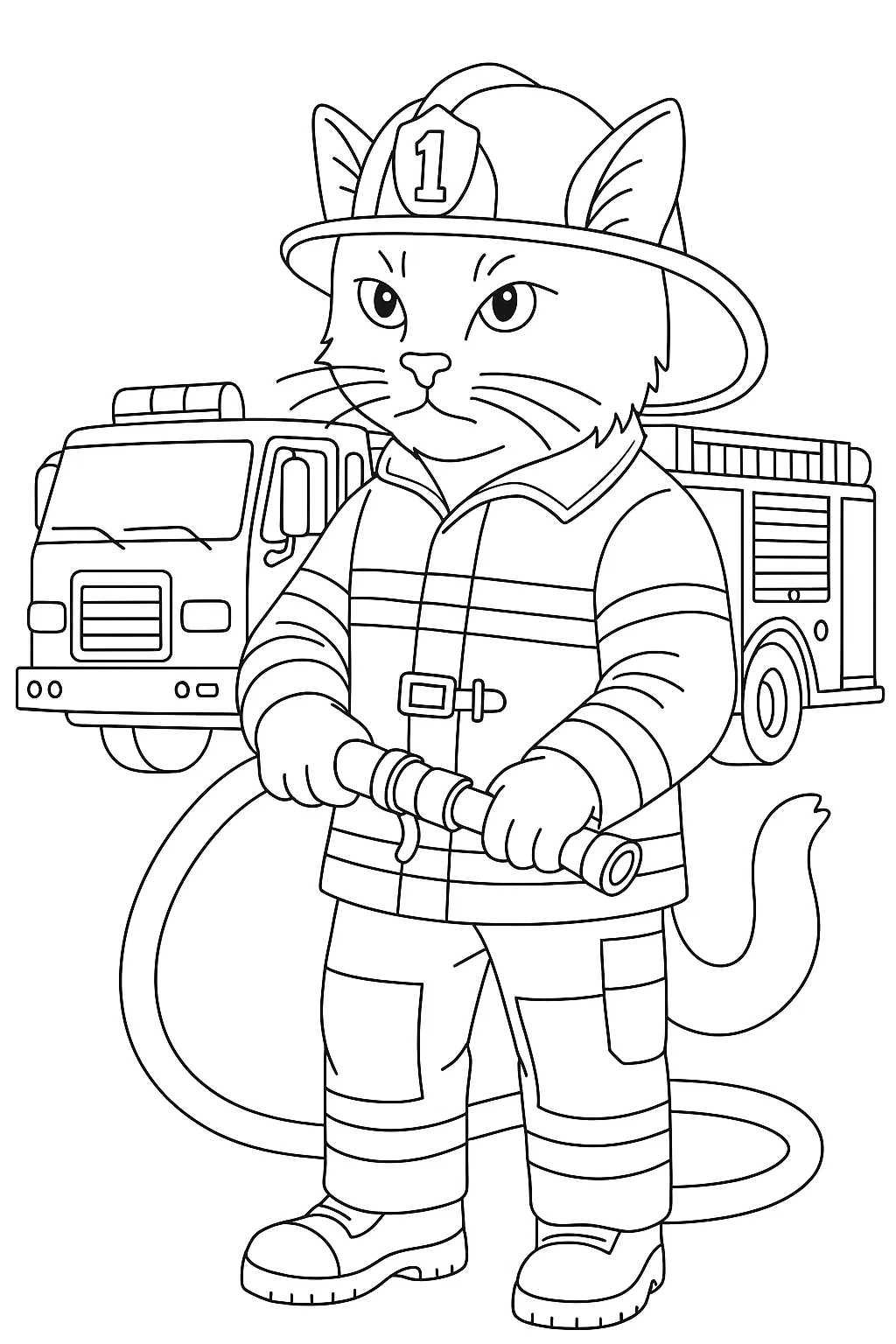 Розмальовки для дівчат кіт-пожежник — цікава розфарбовка, яка навчить дітей важливості мужності та допомоги іншим. Малюнок розмальовка зображує хороброго котика у формі пожежника поруч із пожежною машиною. Така розфарбовка допомагає розвинути дрібну моторику, увагу та уяву, а також формує повагу до професії рятувальників. Розфарбовуйте цього відважного героя яскравими кольорами разом з дітьми. Розфарбовка доступна безкоштовно — її можна скачати та роздрукувати у форматі А4.