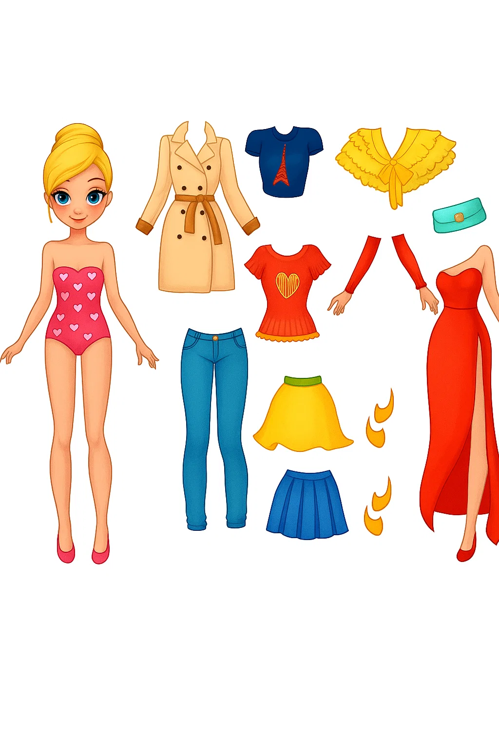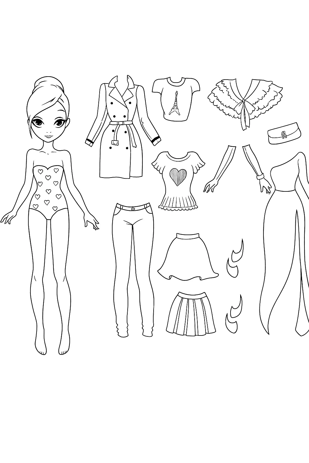 Малюнок розмальовка «Лялька та стильний одяг» — чудова розфарбовка для дівчат, яка відкриває світ моди та стилю. На сторінці зображена витончена лялька та набір модного одягу: штани, спідниці, футболки, вечірнє плаття, плащ, сумочка та аксесуари. Така розфарбовка допоможе розвинути естетичний смак, фантазію та креативне мислення. Малюнок розмальовка легко підходить для дозвілля вдома або творчих занять у дитсадку. Її можна скачати та роздрукувати безкоштовно у форматі А4, щоб подарувати дитині цікаве та корисне заняття.