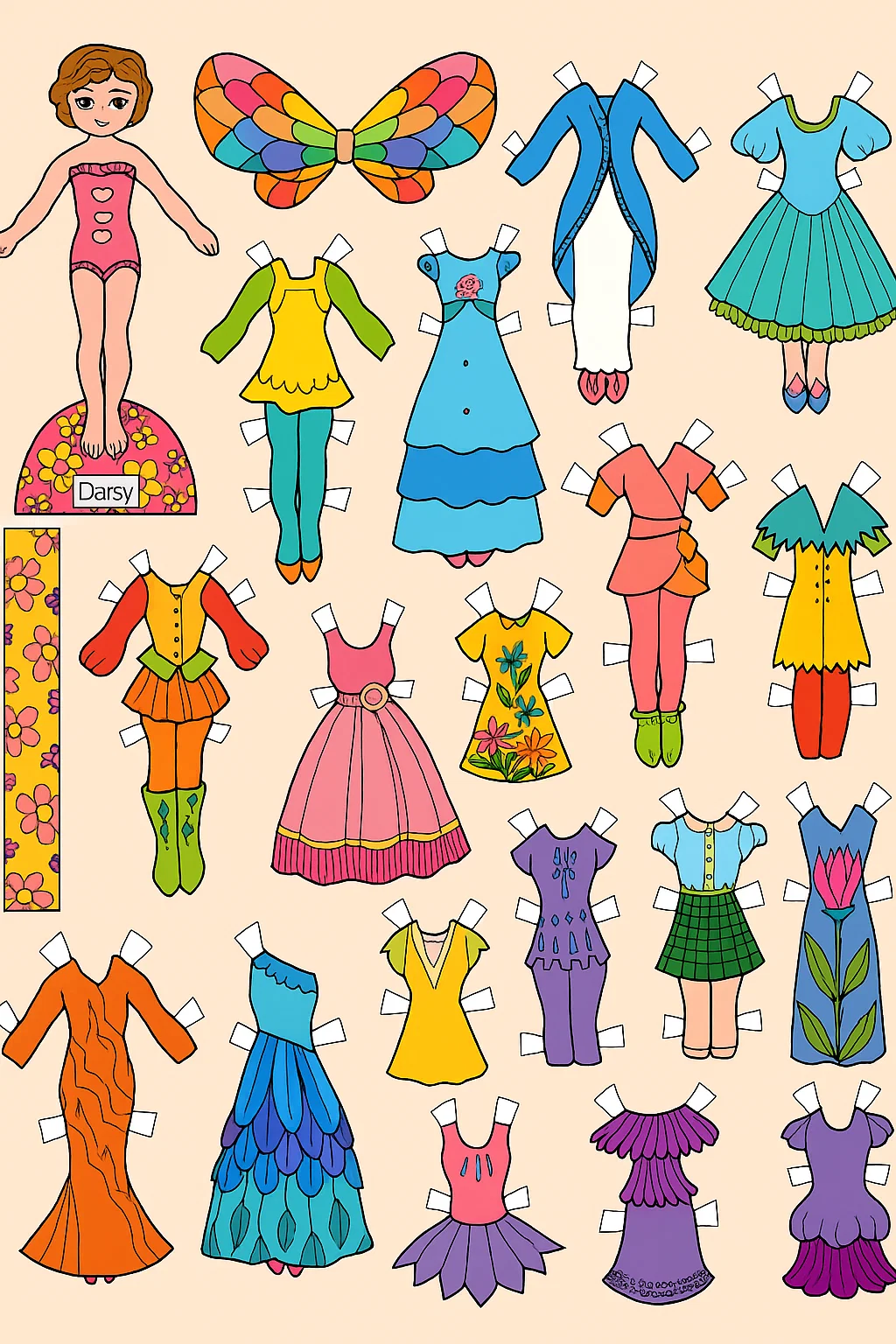 Малюнок розмальовка «Лялька з паперовим гардеробом» — ідеальна розфарбовка для дівчат, які люблять моду та творчість. На сторінці зображено паперову ляльку з безліччю різноманітного одягу: сукні, спідниці, костюми, крила феї та інші елементи, які можна вирізати, розфарбувати та приміряти на ляльку. Така розфарбовка сприяє розвитку фантазії, креативного мислення та дрібної моторики. Малюнок розмальовка розвиває уяву і дарує години захопливого дозвілля. Розфарбовку можна безкоштовно скачати та роздрукувати у форматі А4.