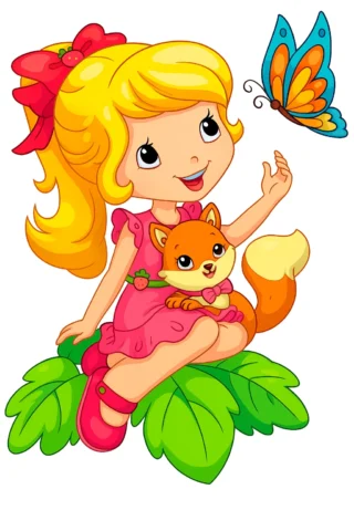 Розмальовки для дівчат: Дівчинка з лисичкою та метеликом