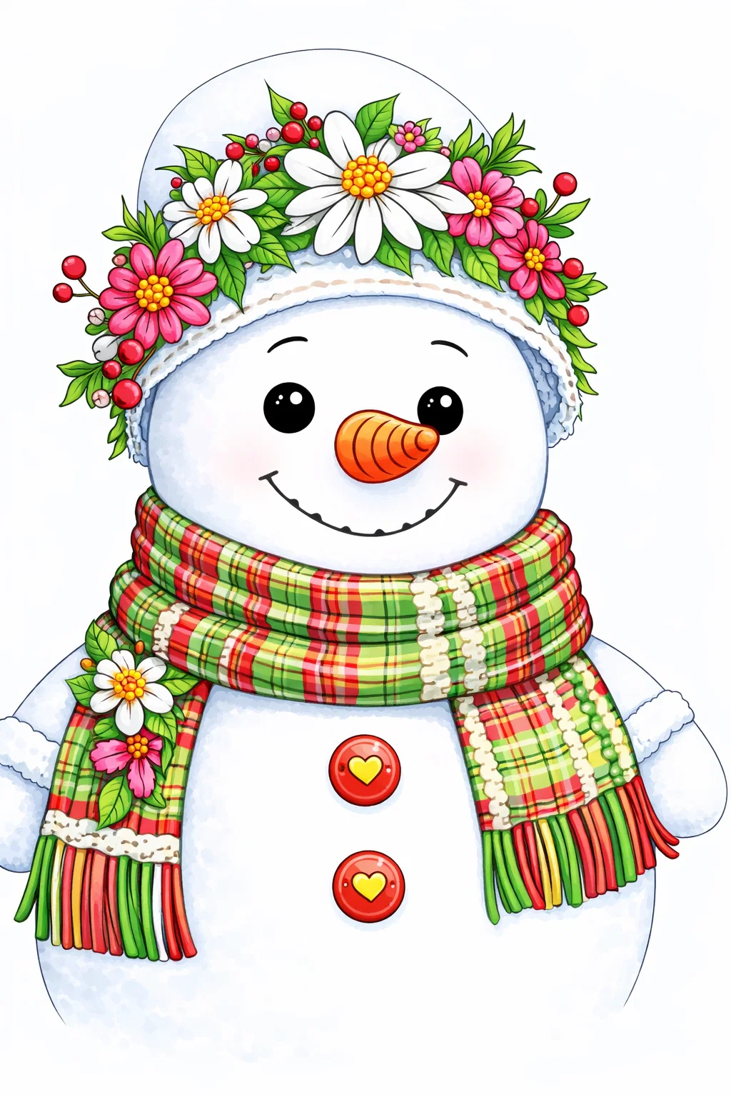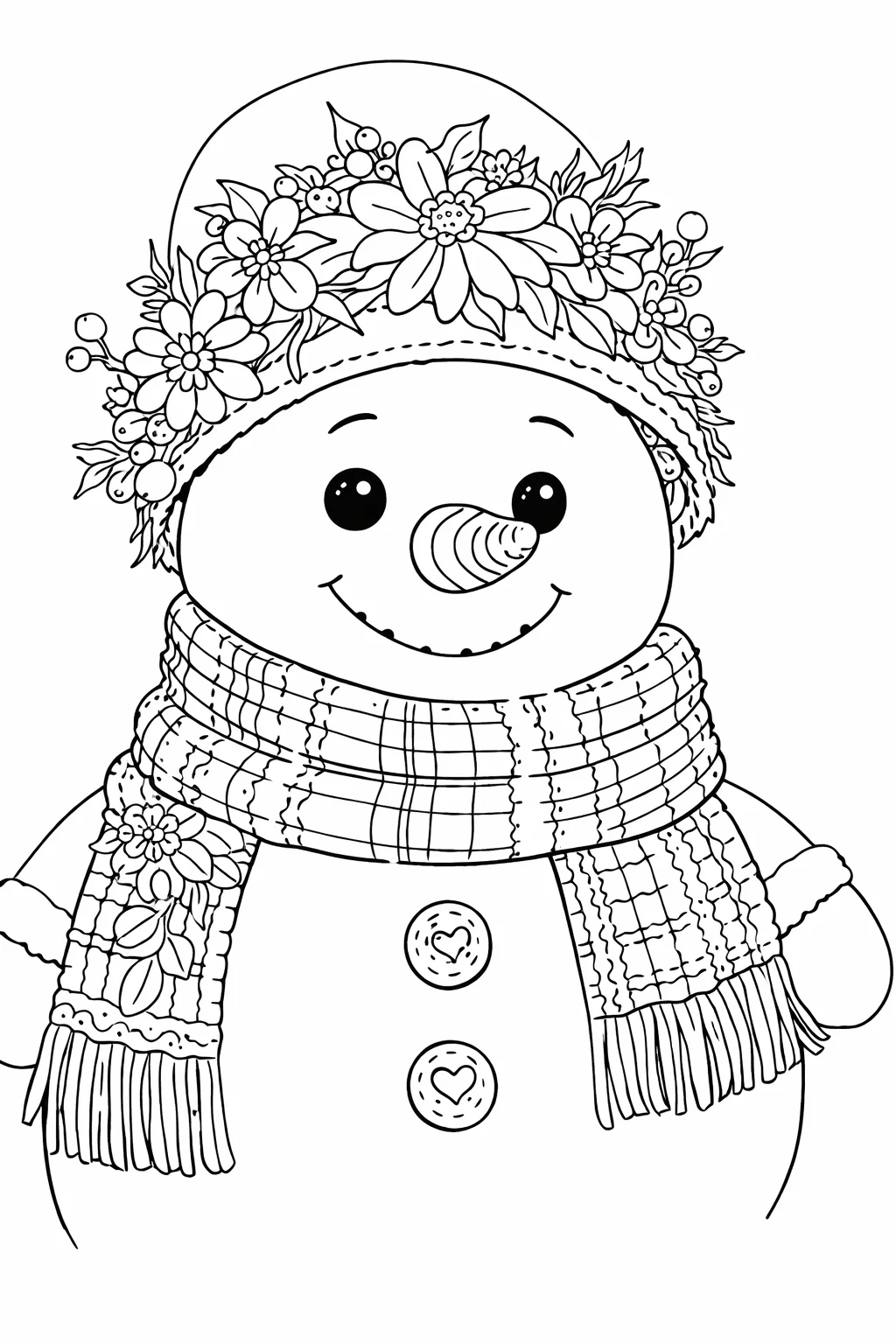 Розмальовка для дорослих «Сніговик із квітковим вінком» — чудова зимова розфарбовка, яка дарує святковий настрій і спокій. Цей милий малюнок розмальовка із сніговиком, прикрашеним квітами, деталізованим шарфом та ґудзиками у формі сердець, стане ідеальним варіантом для творчого дозвілля. Розфарбовка допомагає зняти стрес, розвиває концентрацію та художні навички. Роздрукуйте у форматі А4 та насолоджуйтеся творчим процесом.