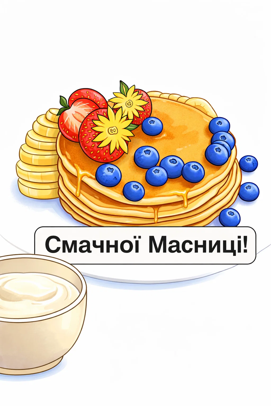Ця святкова розмальовка до Масниці створює атмосферу тепла, гостинності та солодких традицій. На малюнку зображена апетитна стопка млинців, прикрашена ягодами та фруктами, з написом «Смачної Масниці!», що додає святкового настрою. Розфарбовка підходить для дітей і дорослих, допомагає розслабитися, розвиває уяву та уважність. Малюнок розмальовка має чіткі контури, легко розфарбовується та зручно друкується. Така розфарбовка стане чудовою творчою активністю вдома, у школі чи дитячому садку під час святкування Масниці.