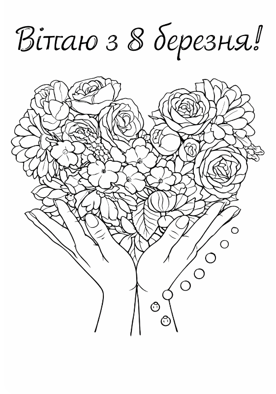 Ця святкова розфарбовка до 8 березня створена спеціально для дорослих, які цінують естетику, релакс і творчість. Вишуканий малюнок розмальовка із жіночими долонями, що тримають пишний весняний букет, символізує ніжність, любов і тепло. Розфарбовка допомагає зняти стрес, розвиває уважність та надихає на творчі експерименти з кольорами. Такий малюнок розмальовка чудово підійде як арт-терапія або як святковий подарунок, який можна роздрукувати у форматі А4 та прикрасити власноруч.