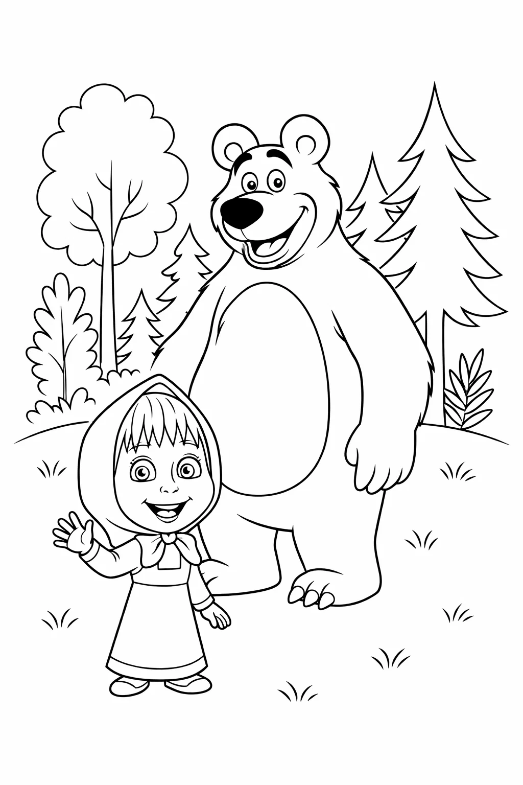 Кольорова та доброзичлива розфарбовка з популярними героями мультфільмів стане чудовим вибором для дитячої творчості. Малюнок розмальовка з Машею та Ведмедем на лісовій галявині передає теплу атмосферу дружби, природи та гарного настрою. Яскраві образи персонажів легко впізнаються й надихають дітей із задоволенням братися за розфарбовку. Чіткі контури дозволяють зручно розфарбовувати малюнок розмальовка олівцями, фломастерами або фарбами. Така розфарбовка допомагає розвивати фантазію, уважність, дрібну моторику та любов до творчості. Картинку можна безкоштовно скачати та роздрукувати у форматі А4 для занять удома чи в дитячому садку.