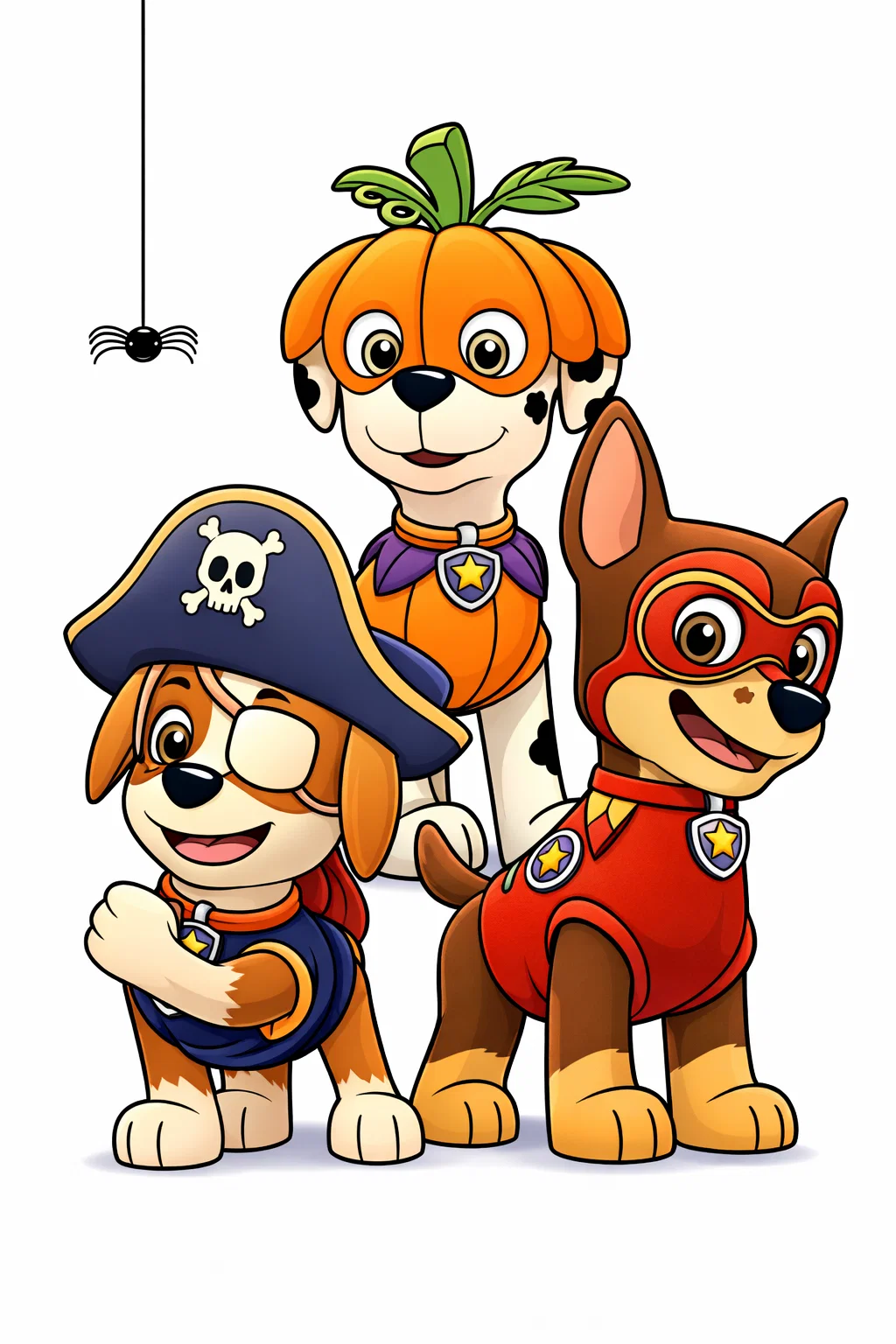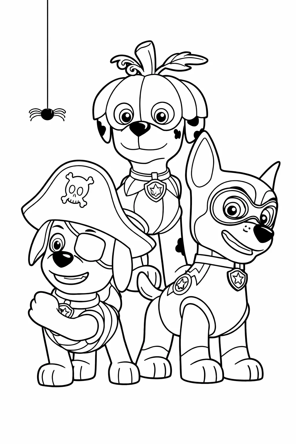 Ця розмальовка з героями улюбленого мультфільму “Щенячий патруль” у святкових костюмах до Хелловіну стане чудовим заняттям для дітей будь-якого віку. Малюнок розмальовка включає трьох веселих щенят у костюмах пірата, супергероя та гарбуза, що пробуджує фантазію та творчість. Розфарбовка допоможе дітям розвивати моторику рук, уважність і кольорове мислення. Ідеально підходить для святкових занять у школі, дитячому садочку або вдома. Малюнок доступний для безкоштовного завантаження та друку у форматі А4.