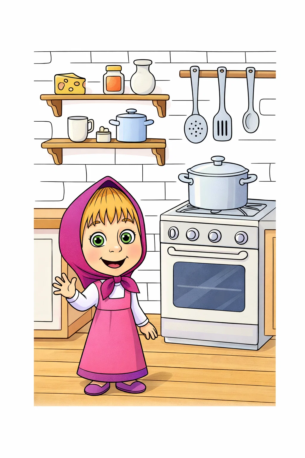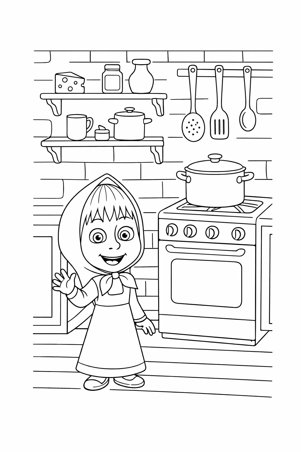 Цікава та пізнавальна розфарбовка з улюбленого мультфільму чудово підійде для творчих занять дітей. На цьому зображенні Маша стоїть на кухні біля плити, де готується смачна страва, а навколо розміщений кухонний посуд. Така розмальовка допомагає дитині в ігровій формі познайомитися з побутом і кухонними предметами. Малюнок розмальовка має чіткі лінії та прості елементи, що ідеально підходить для малюків. Розфарбовка розвиває фантазію, уважність, дрібну моторику та інтерес до творчості. Картинку легко скачати безкоштовно і роздрукувати у форматі А4 для занять вдома чи в дитячому садку.