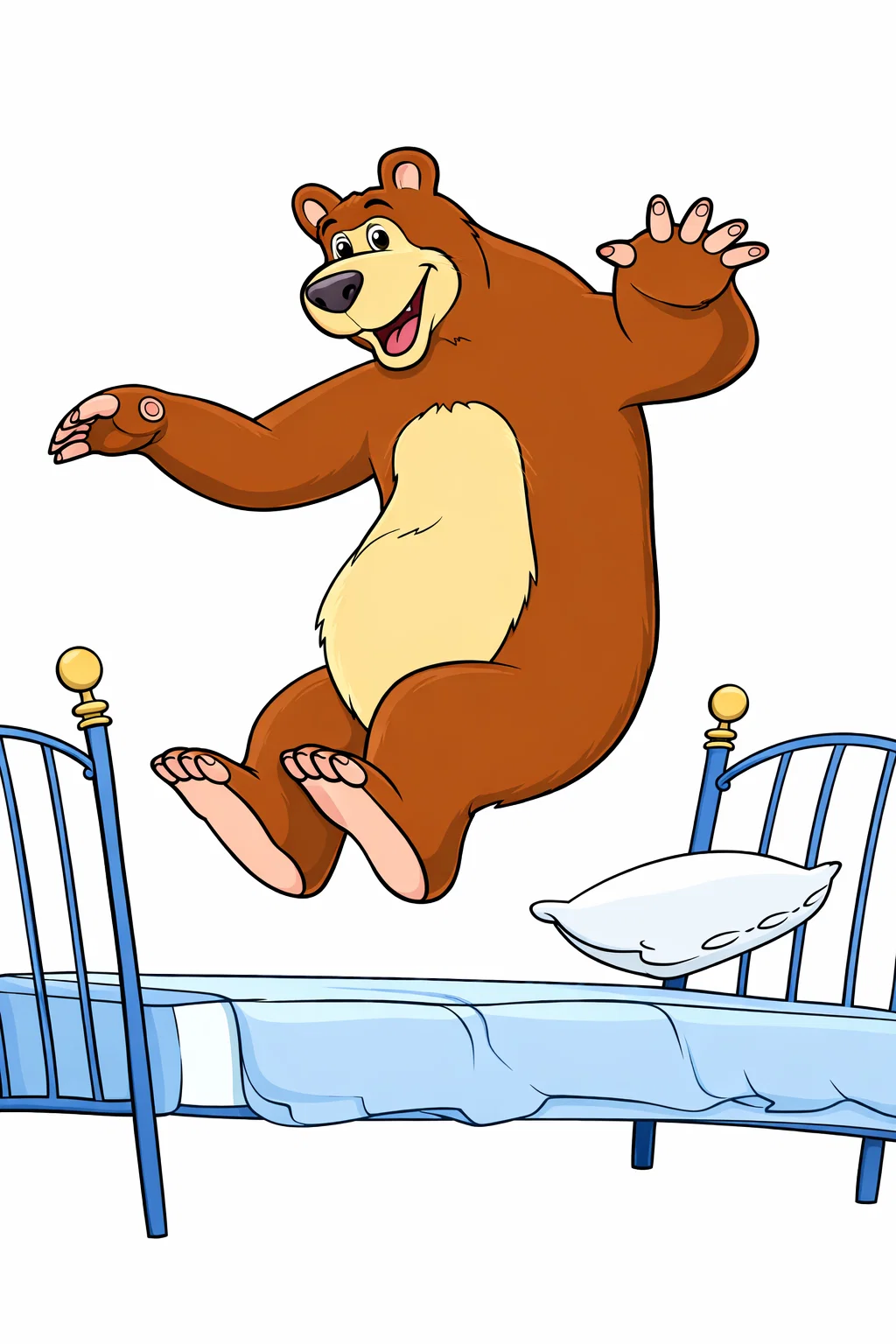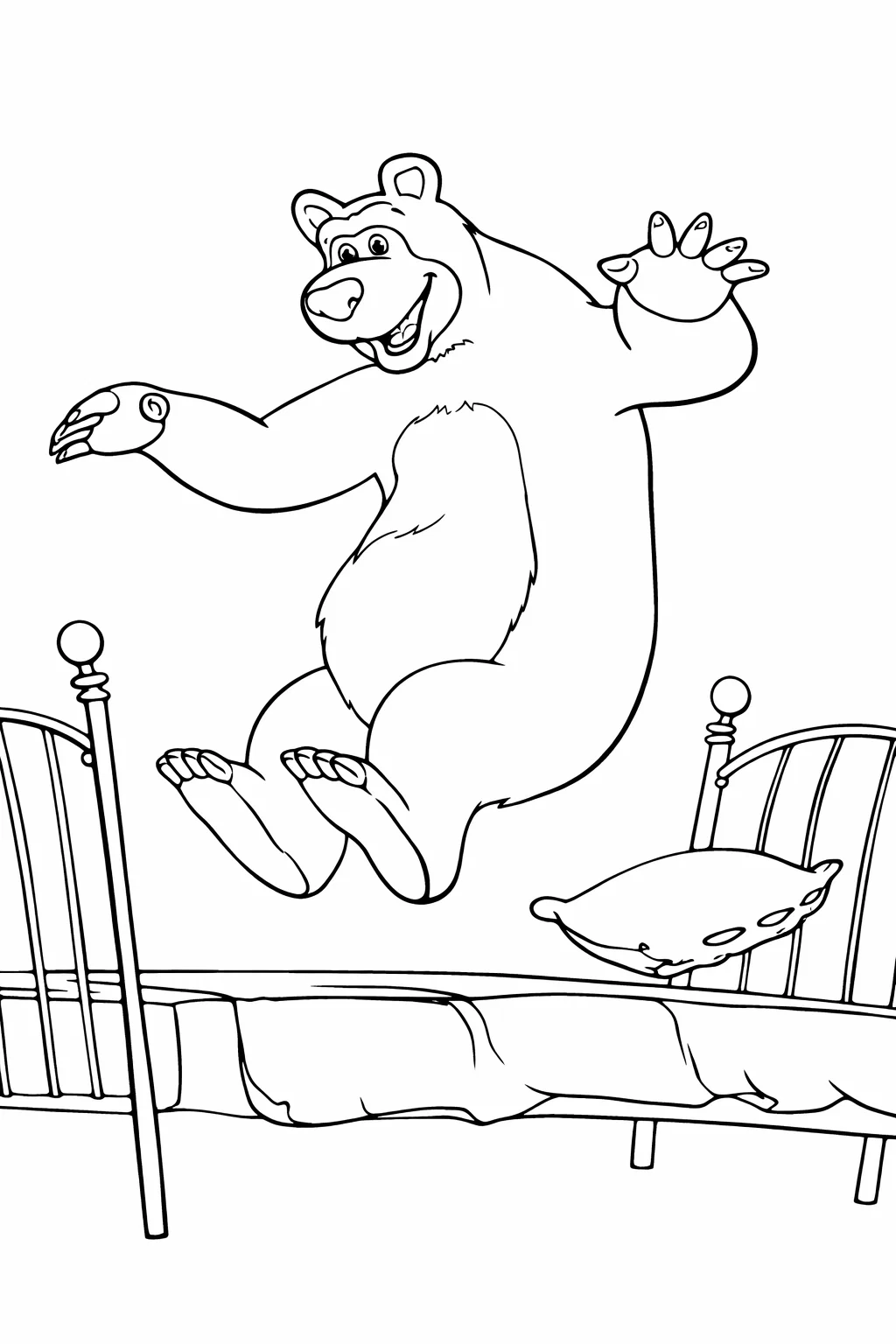 Весела та динамічна розфарбовка з персонажами із мультфільмів подарує дітям багато радості та позитивних емоцій. На цьому малюнку розмальовка зображений кумедний Ведмідь, який стрибає на ліжку, створюючи атмосферу гри й пустощів. Чіткі лінії та великі деталі роблять цю розфарбовку ідеальною для дітей різного віку. Малюнок розмальовка допомагає розвивати дрібну моторику, фантазію, уважність і творчі здібності. Картинку легко скачати та роздрукувати у форматі А4 для занять удома, у дитячому садку чи школі.