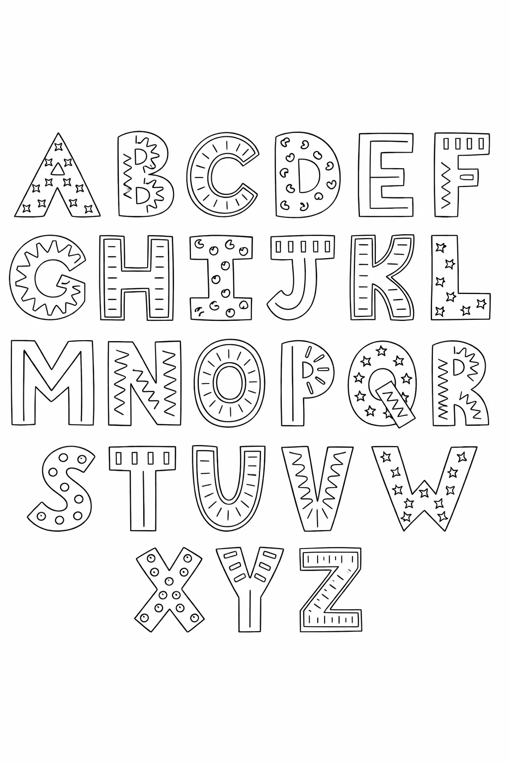 Цей малюнок розмальовка з англійським алфавітом — ідеальна розфарбовка для розвитку дітей різного віку. Кожна літера оформлена в унікальному стилі, що робить процес навчання веселим і творчим. Розфарбовуючи літери, дитина не лише запам’ятовує алфавіт, а й розвиває дрібну моторику, увагу та уяву. Малюнок розмальовка підходить як для занять у дитячому садку, школі, так і для домашнього використання. Завантажуйте та роздруковуйте безкоштовно в зручному форматі А4 та перетворіть навчання на гру!