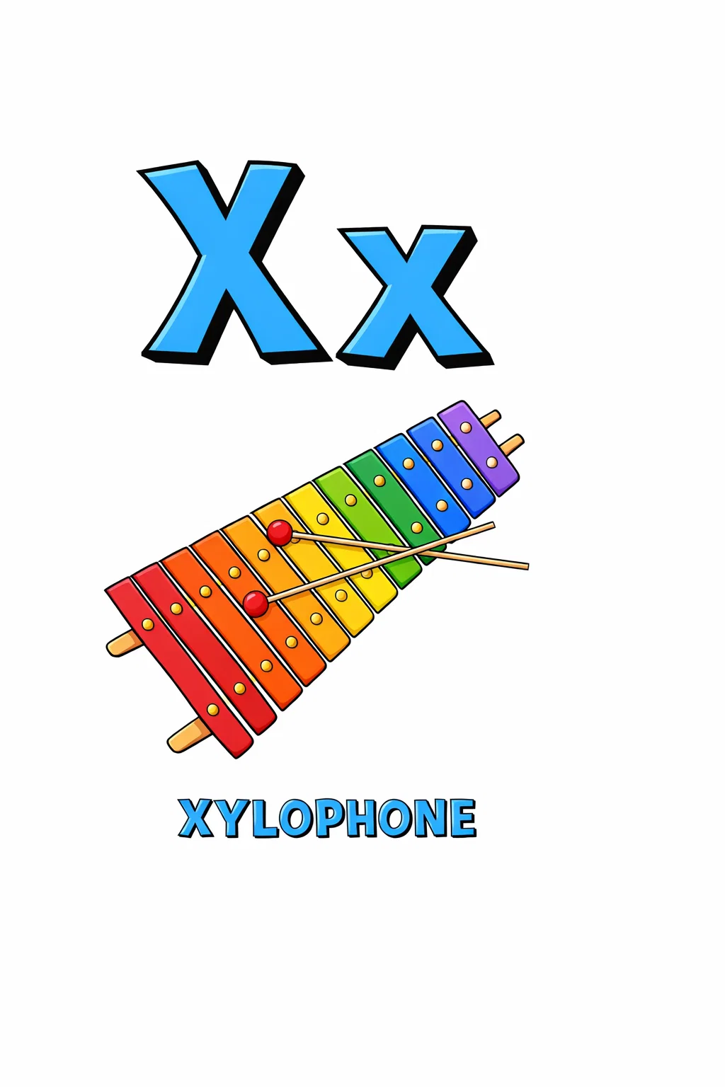 Освітній малюнок розмальовка з англійською буквою X та зображенням музичного інструмента — ксилофона (xylophone) стане чудовим доповненням до занять з вивчення алфавіту. Розфарбовка поєднує навчання і творчість, сприяючи розвитку дрібної моторики, пам’яті та мовних навичок. Простий, але пізнавальний малюнок розмальовка буде цікавим для дітей різного віку. Завантажуйте безкоштовно та роздруковуйте у форматі А4, щоб зробити процес вивчення англійської літери X захоплюючим і яскравим.