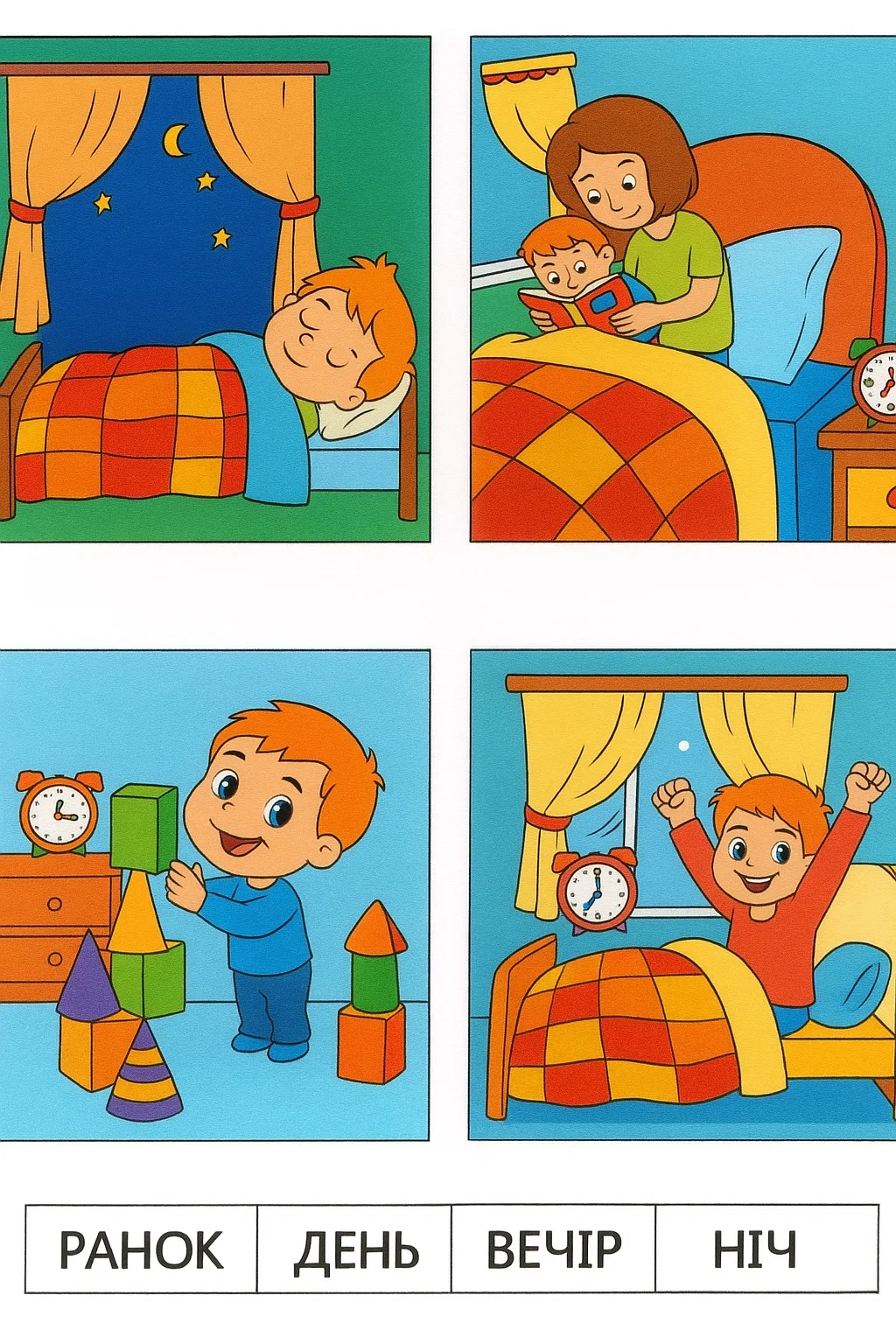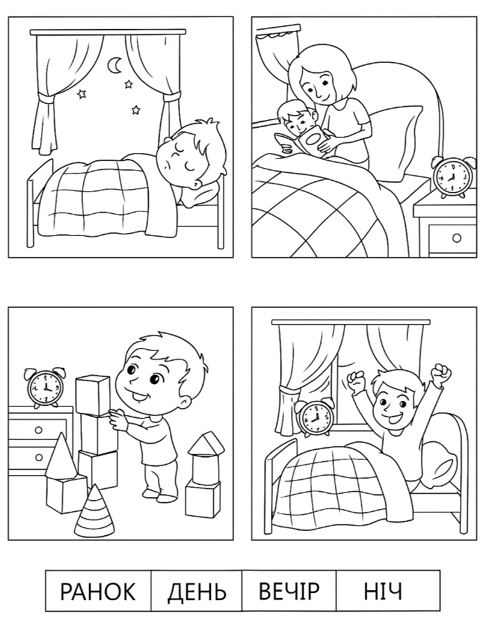 Розвиваючі розмальовки день доби — це чудовий навчальний матеріал для дітей, який допомагає вивчити основні частини доби: ранок, день, вечір і ніч. Така розфарбовка у вигляді цікавого малюнка допомагає малюкам запам’ятати послідовність подій протягом дня — коли прокидатися, грати, читати чи спати. Розфарбовуючи малюнок розмальовку, дитина розвиває уважність, дрібну моторику й мислення. Цю розфарбовку легко скачати та роздрукувати у форматі А4, щоб навчання перетворилося на веселу гру.