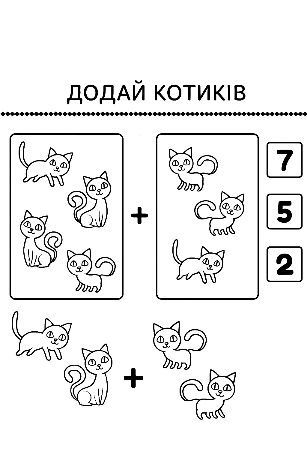 Розвиваючі розмальовки “додай котиків” — чудова ідея для дітей, щоб навчити їх рахувати та розпізнавати цифри. У малюнку розмальовка зображені котики, яких потрібно додавати та підбирати правильні відповіді за допомогою цифр. Це не тільки весела розвага, але й корисне заняття для розвитку логічного мислення та математичних навичок у малюків. Завантажте та роздрукуйте цей малюнок для розфарбовування в форматі А4 для дитячих занять вдома або в садочку.