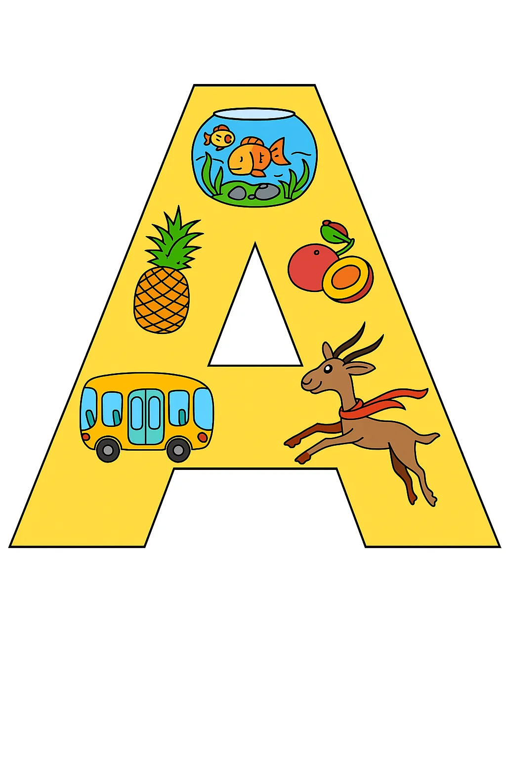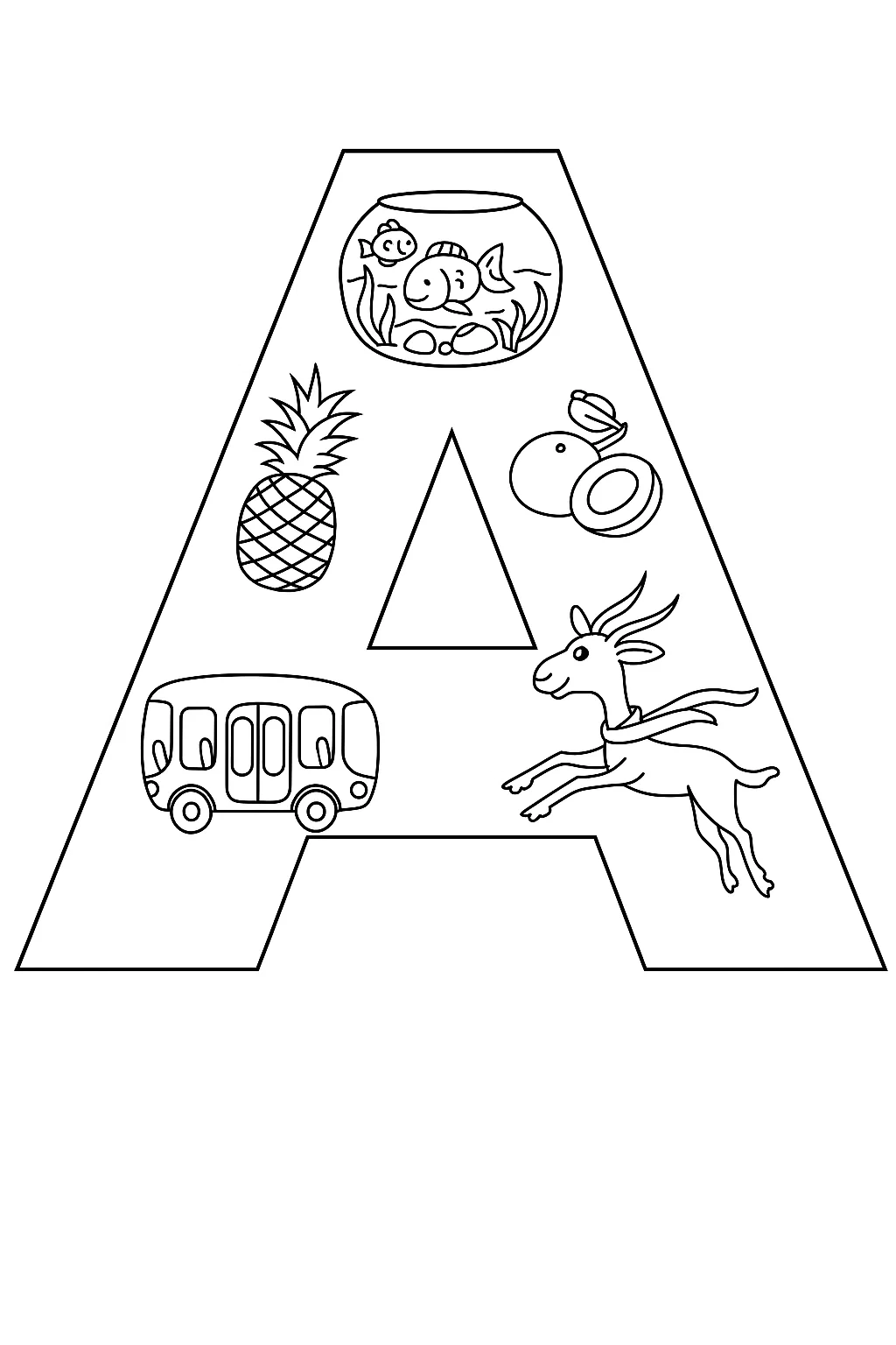 Розвиваючі розмальовки літера А — чудова розфарбовка для малюків, яка допомагає дітям вивчати абетку в інтерактивній та веселій формі. У малюнку розмальовка до літери А зображені різні предмети, що починаються на цю букву: ананас, автобус, апельсин та багато іншого. Це заняття сприяє розвитку логічного мислення, покращує координацію рухів та знайомить малюків з навколишнім світом через гру. Скачайте та роздрукуйте цей малюнок для розфарбовування в форматі А4 для дитячих занять вдома.
