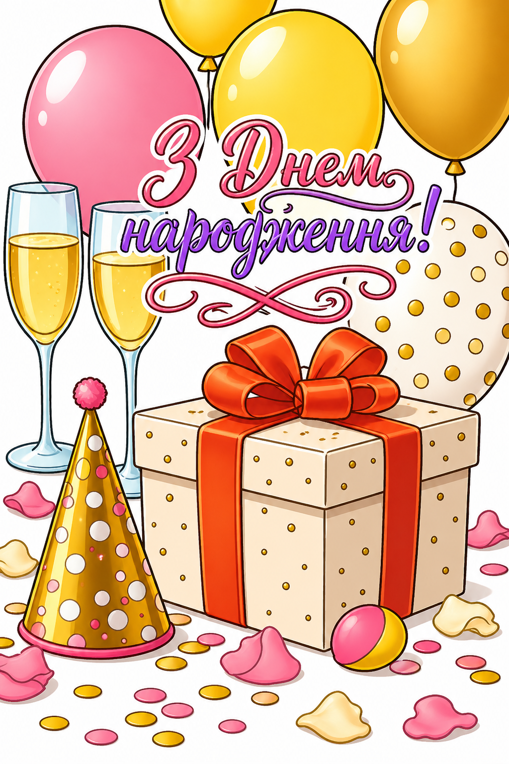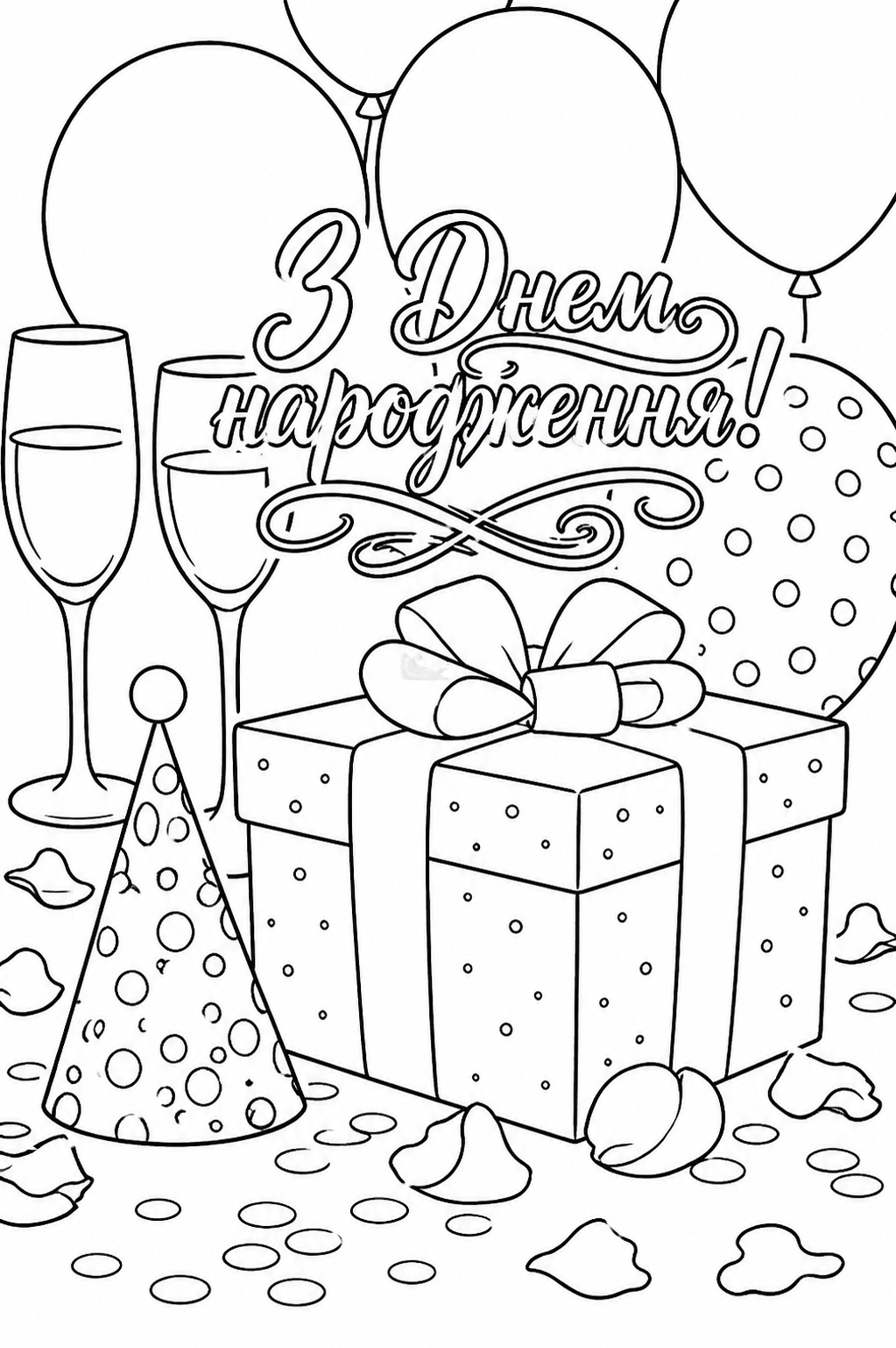Яскрава розфарбовка «Святкова листівка з подарунком і кульками» стане чудовим вибором для дитячої творчості та створення настрою свята. На малюнку розмальовка зображено подарунок із бантом, повітряні кульки, святковий ковпак і келихи з написом «З Днем народження!». Така розфарбовка допомагає розвивати фантазію, уважність і дрібну моторику. Малюнок розмальовка має чіткі контури, що дозволяє легко розфарбовувати його олівцями, фломастерами або фарбами. Ви можете скачати розфарбовку та роздрукувати у форматі А4 для створення власної святкової листівки.