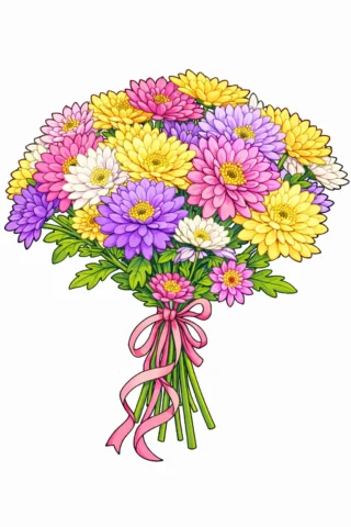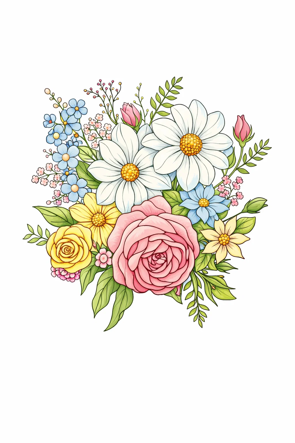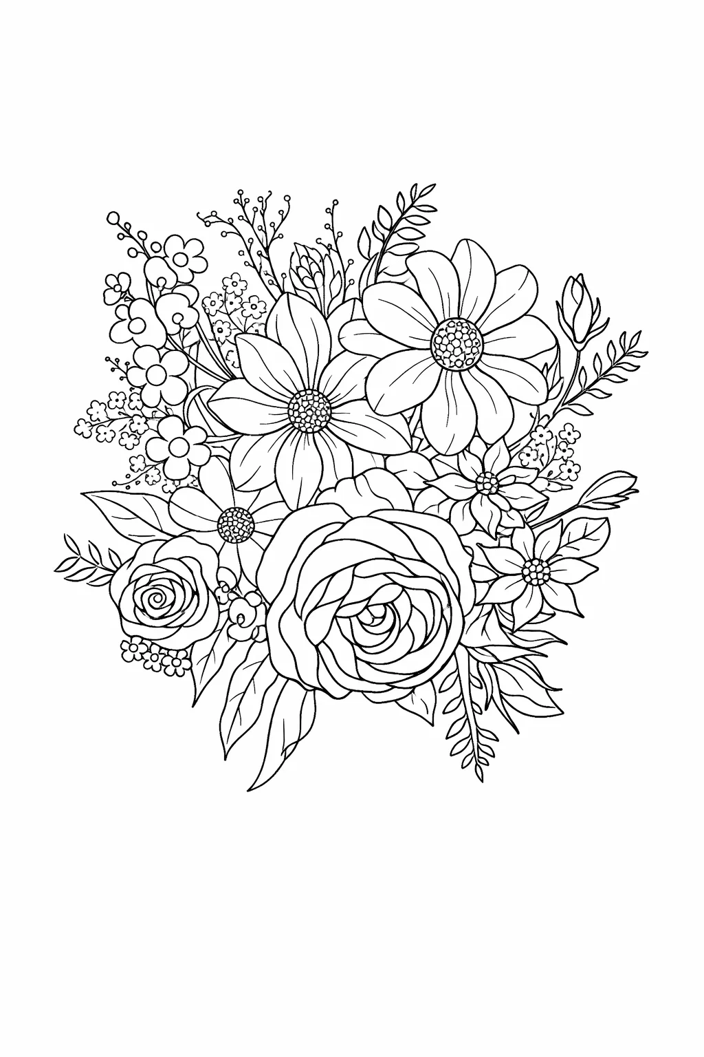 Детальна квіткова розфарбовка зі святковим букетом стане чудовою ідеєю для творчого відпочинку та підготовки до свят. Вишуканий малюнок розмальовка з трояндами, польовими квітами та декоративним листям допоможе створити красиву кольорову композицію. Така розфарбовка підходить як для дітей, так і для дорослих, розвиває уяву, уважність та любов до творчості. Малюнок розмальовка можна легко скачати та роздрукувати в форматі А4, щоб використовувати для створення листівок, прикрас або просто приємного творчого заняття вдома чи в школі.
