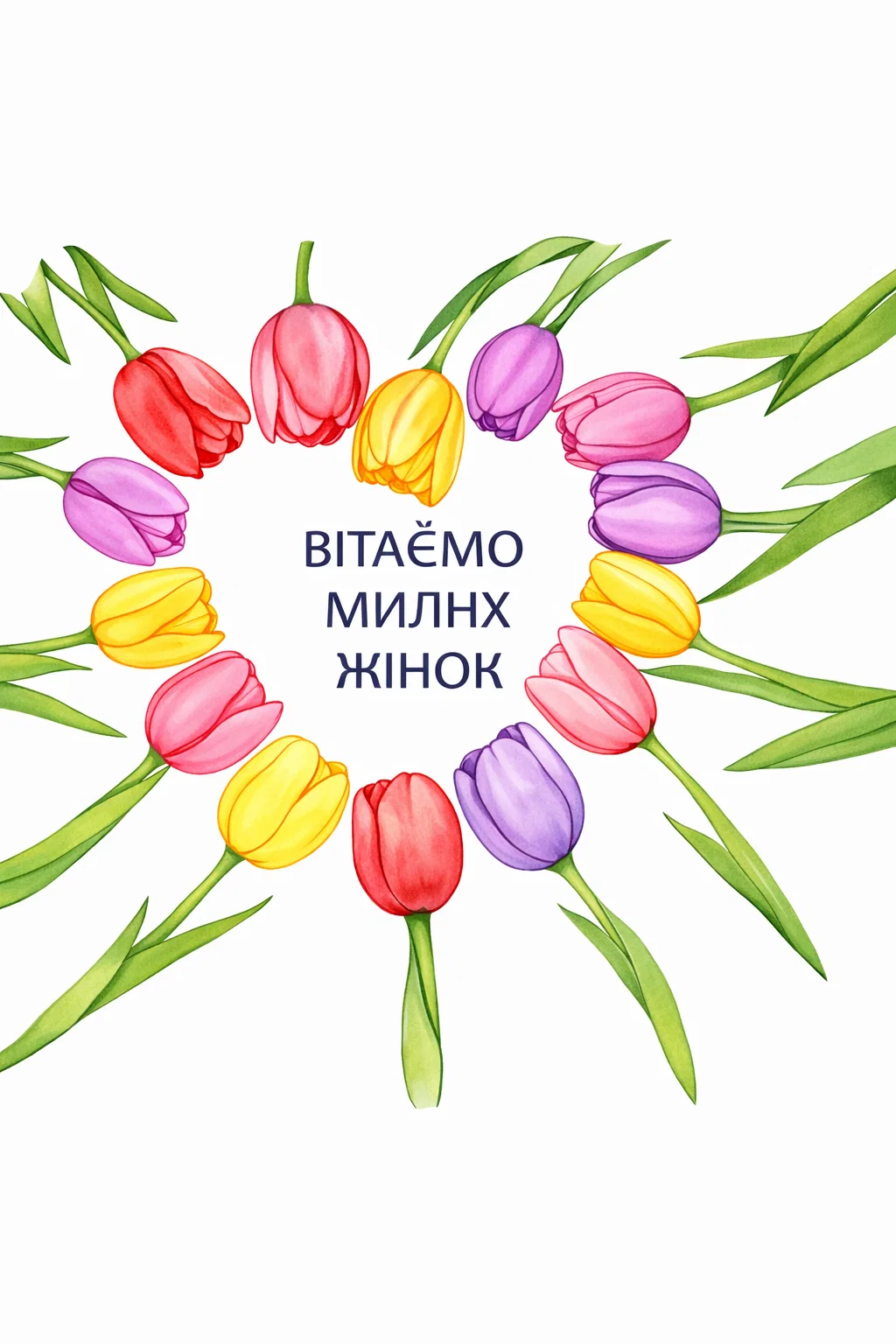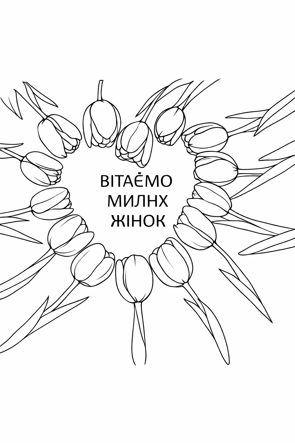 Красива святкова розфарбовка з вінком із тюльпанів та привітальним написом «Вітаємо милих жінок» стане чудовою творчою ідеєю до весняних свят. На ілюстрації зображено ніжні тюльпани, що утворюють декоративний квітковий вінок. Такий малюнок розмальовка чудово підходить для створення святкової листівки або прикраси. Розфарбовка допомагає розвивати творчі здібності, уважність і фантазію як у дітей, так і у дорослих. Малюнок розмальовка легко скачати та роздрукувати у форматі А4, щоб використовувати для творчих занять вдома, у школі чи дитячому садку.